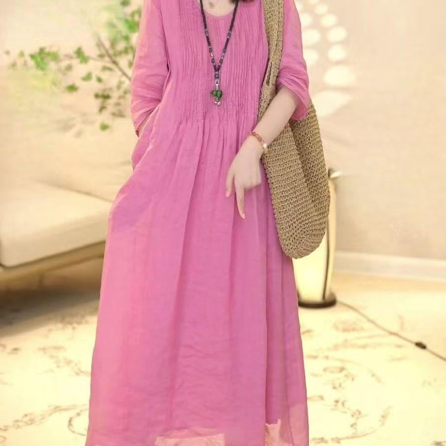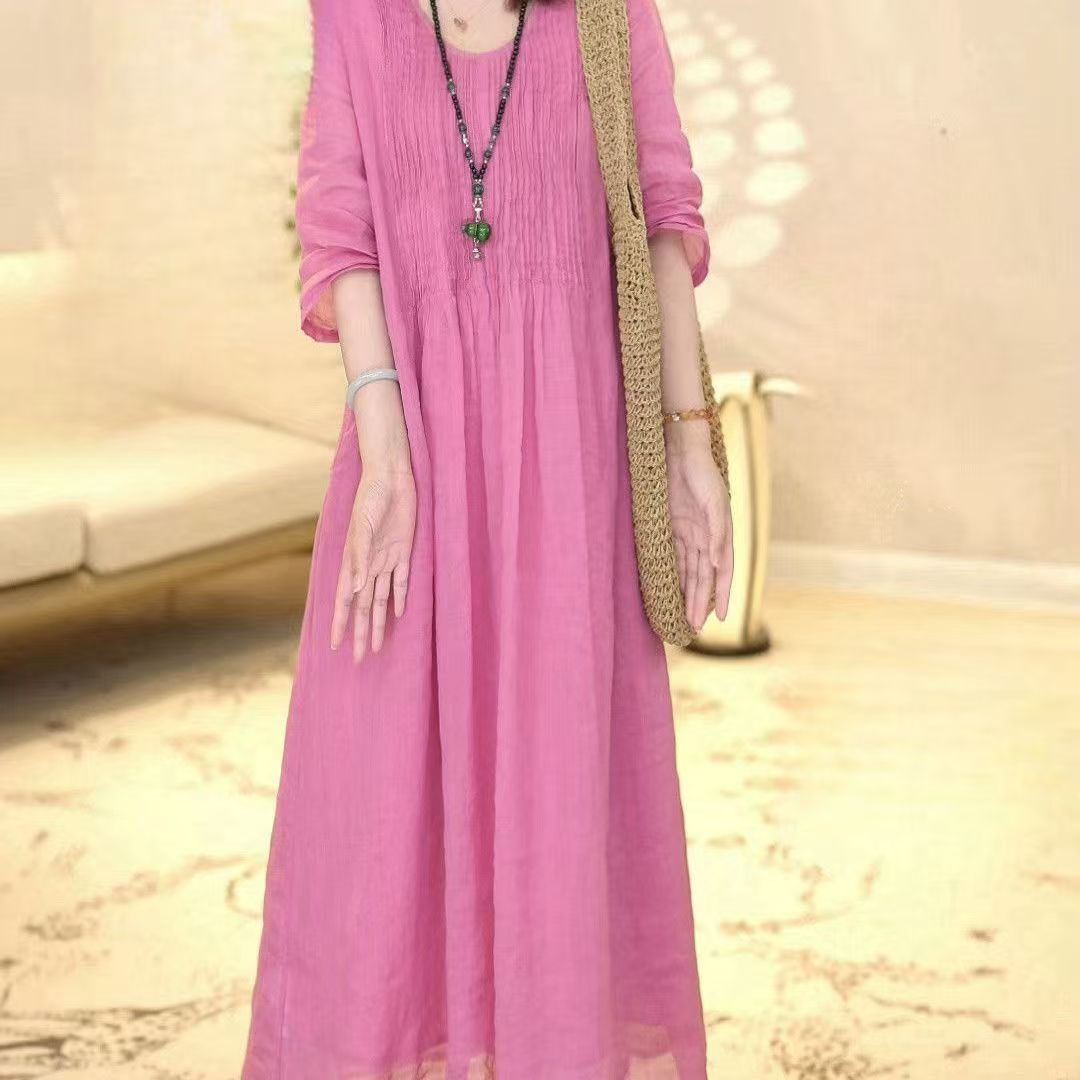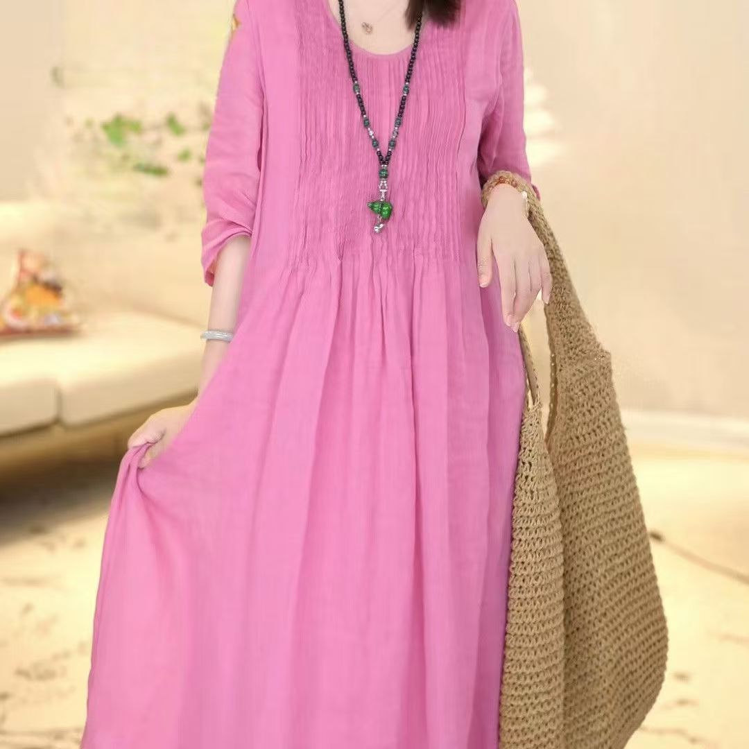 夏季新款苎麻连衣裙褶皱设计中袖中年大码气质棉麻长裙~清仓尾货