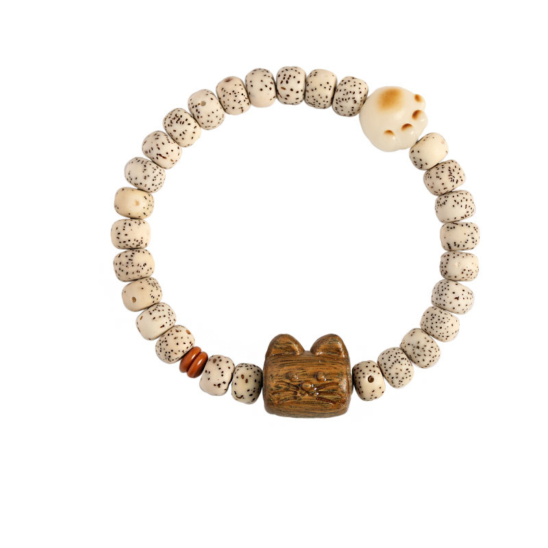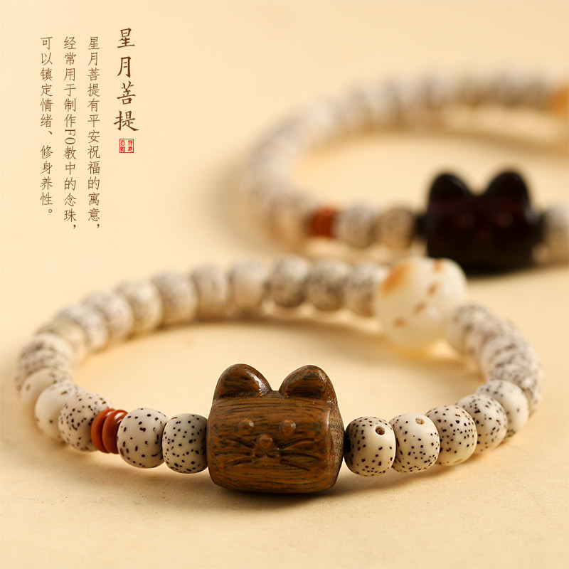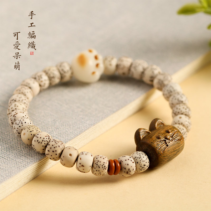天然星月菩提原籽手串呆萌可爱炭烧小猫爪檀木五福小猫咪女款手串