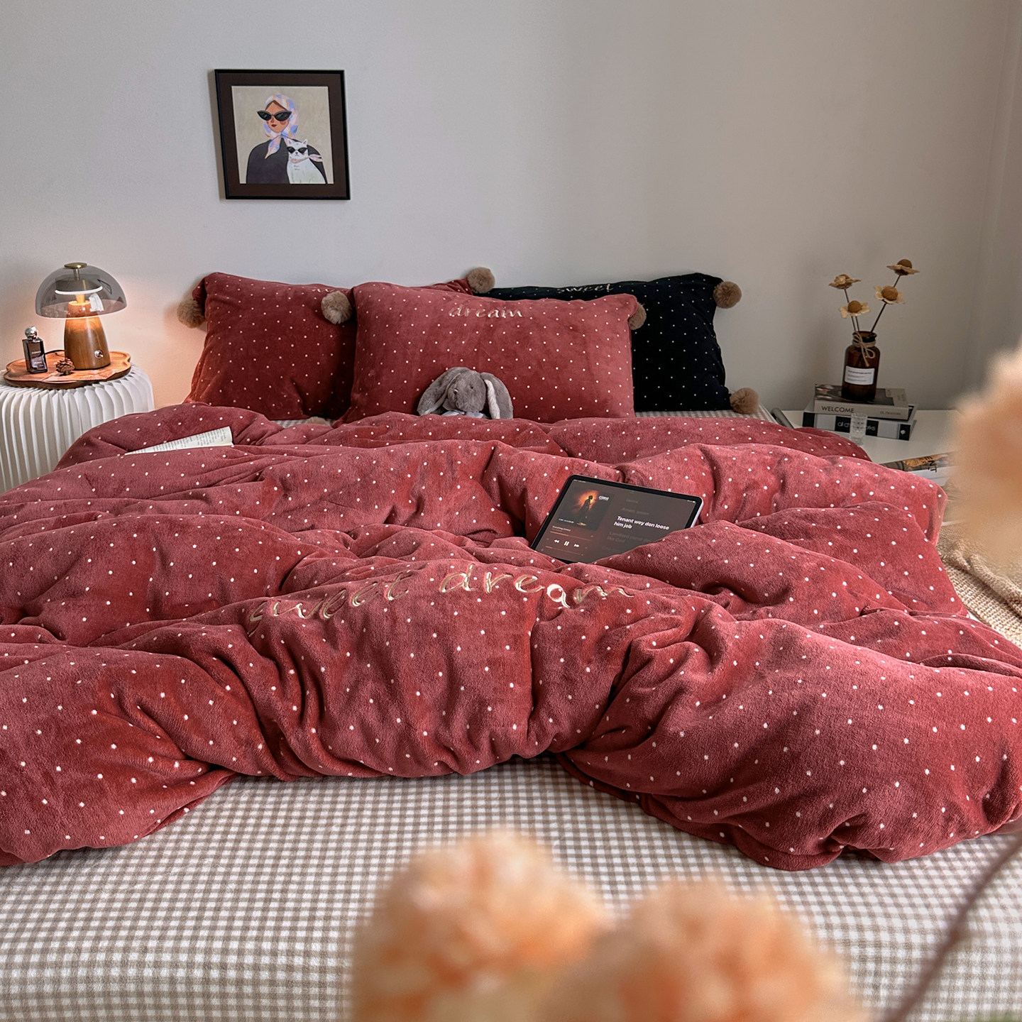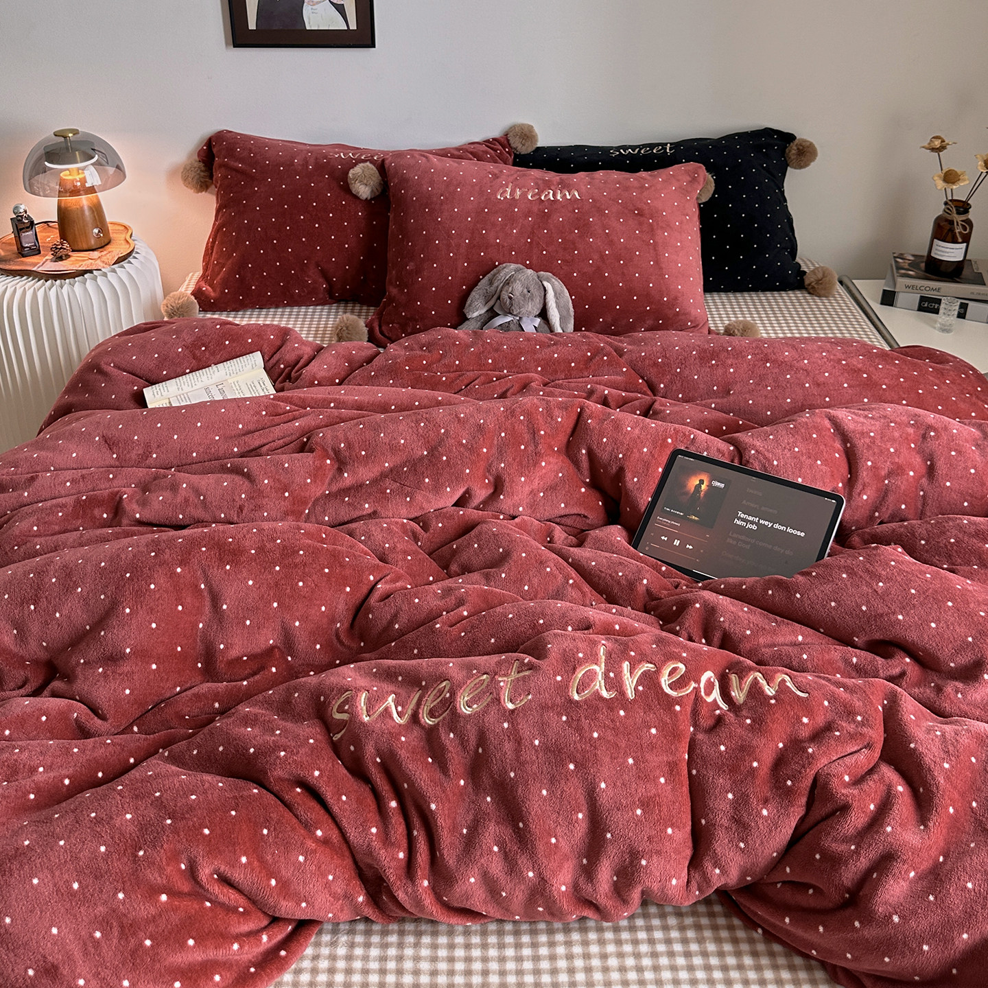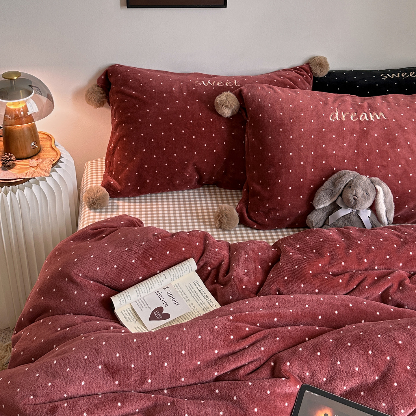 ins撞色格子波点冬季保暖牛奶绒刺绣四件套毛球款舒适珊瑚绒床品