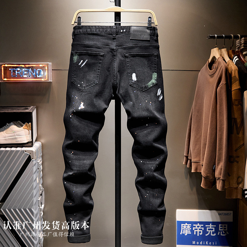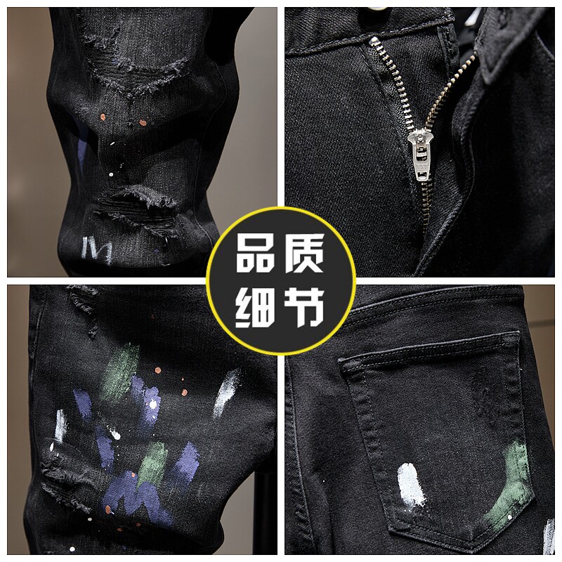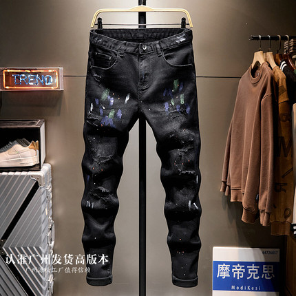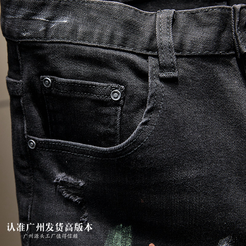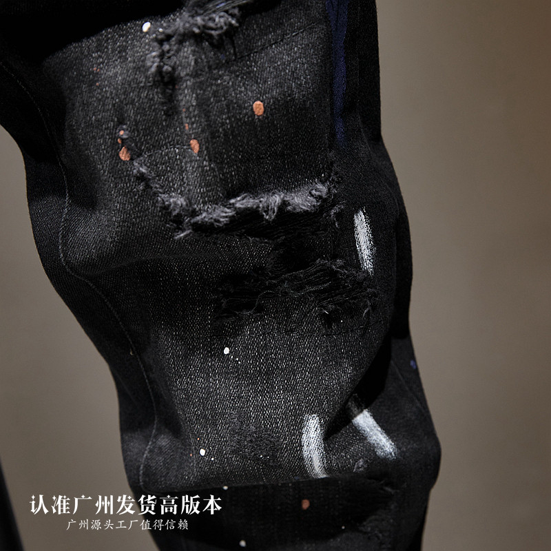 高端潮黑色破洞九分牛仔裤男士秋冬潮牌痞帅泼墨喷漆乞丐9分小脚