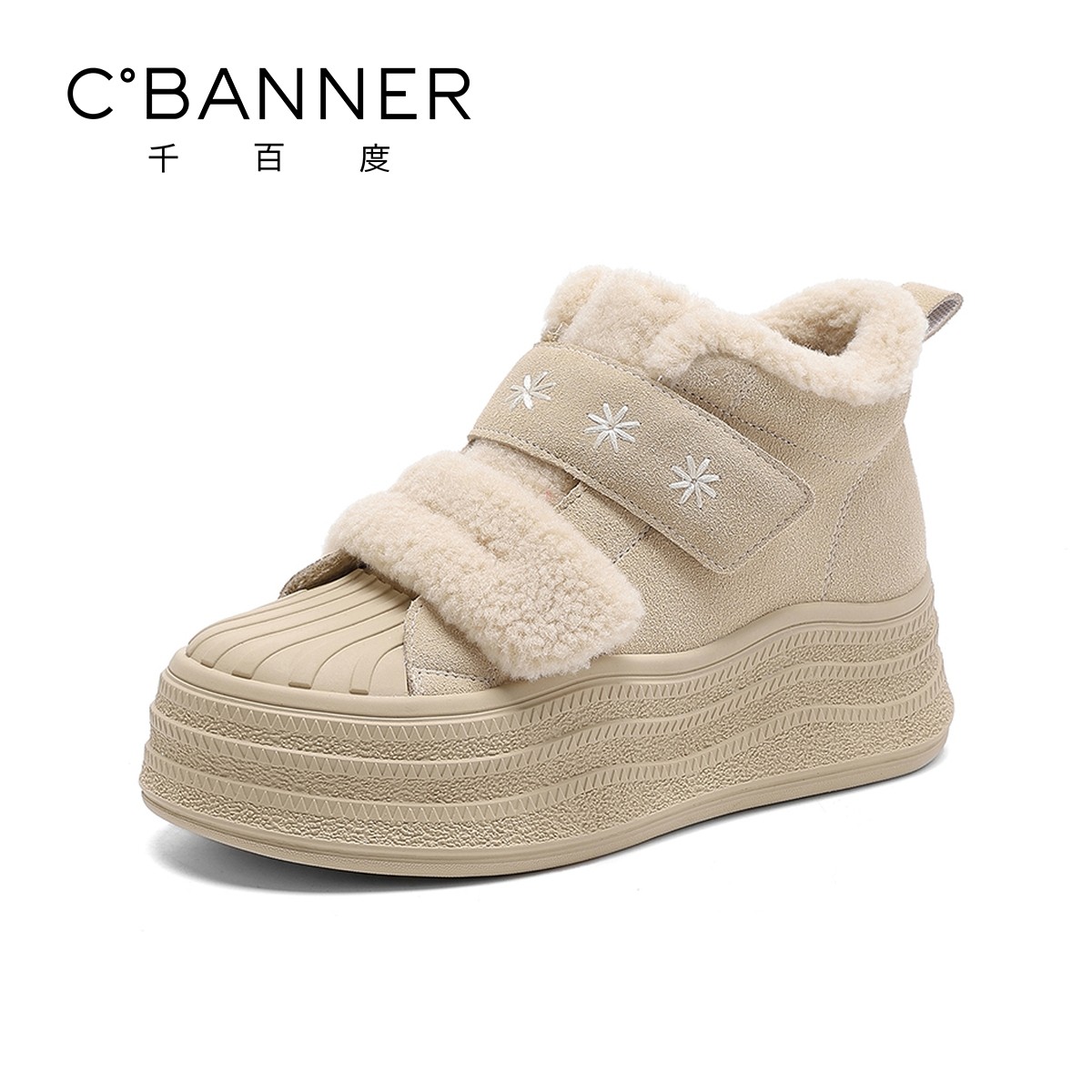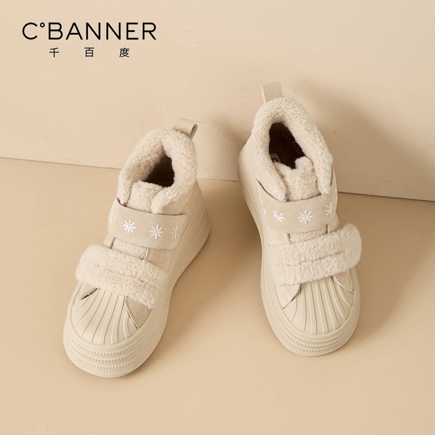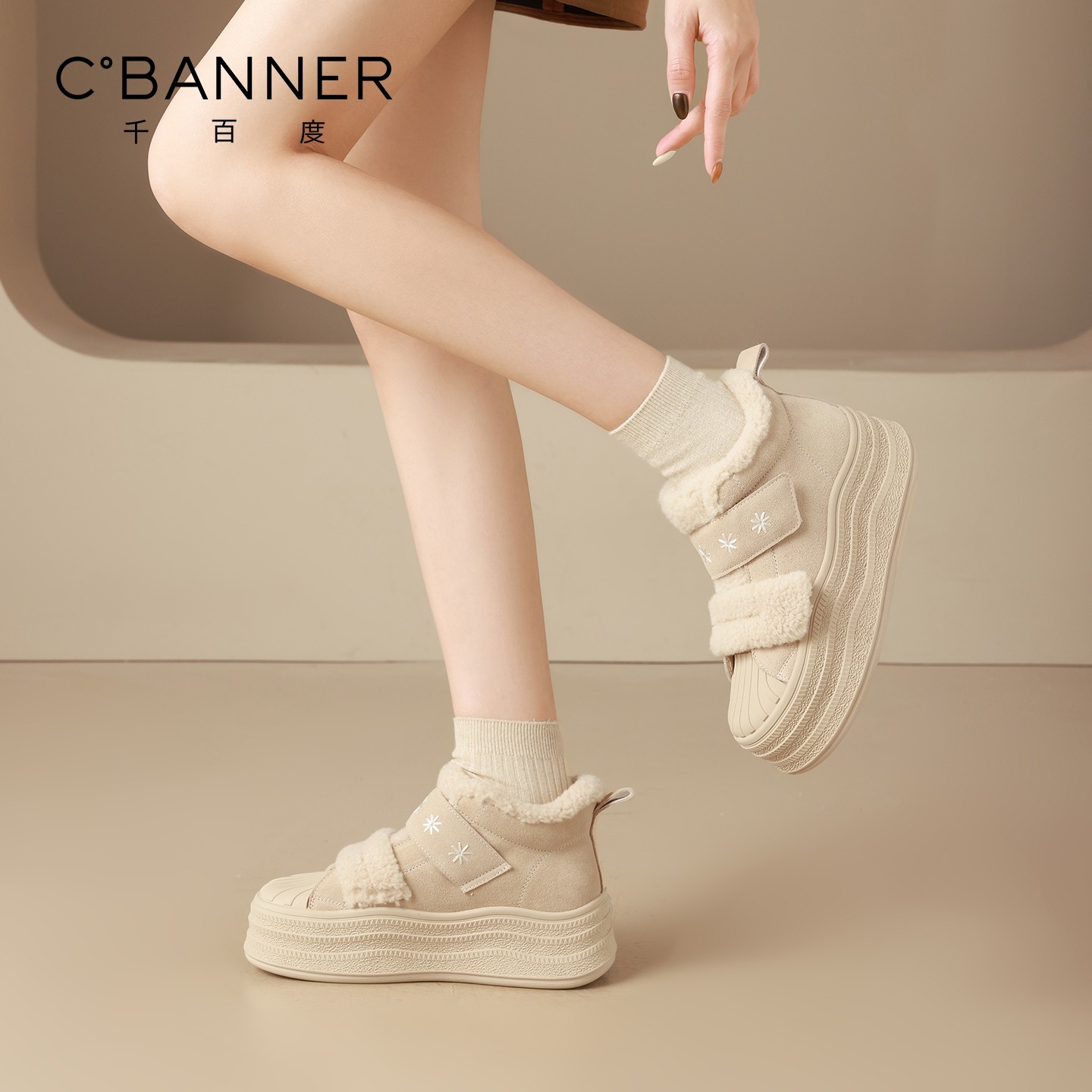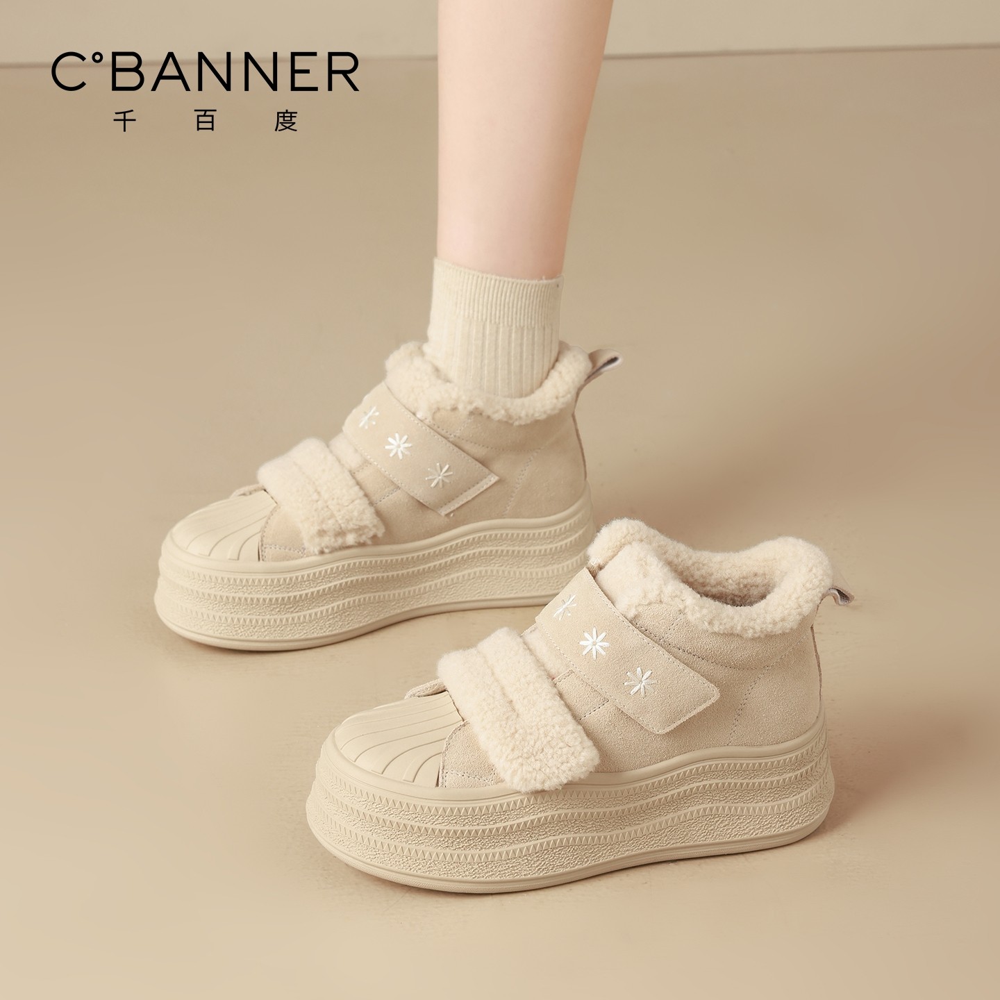 千百度厚底高帮板鞋女加绒冬2025新款百搭运动休闲鞋保暖贝壳棉鞋