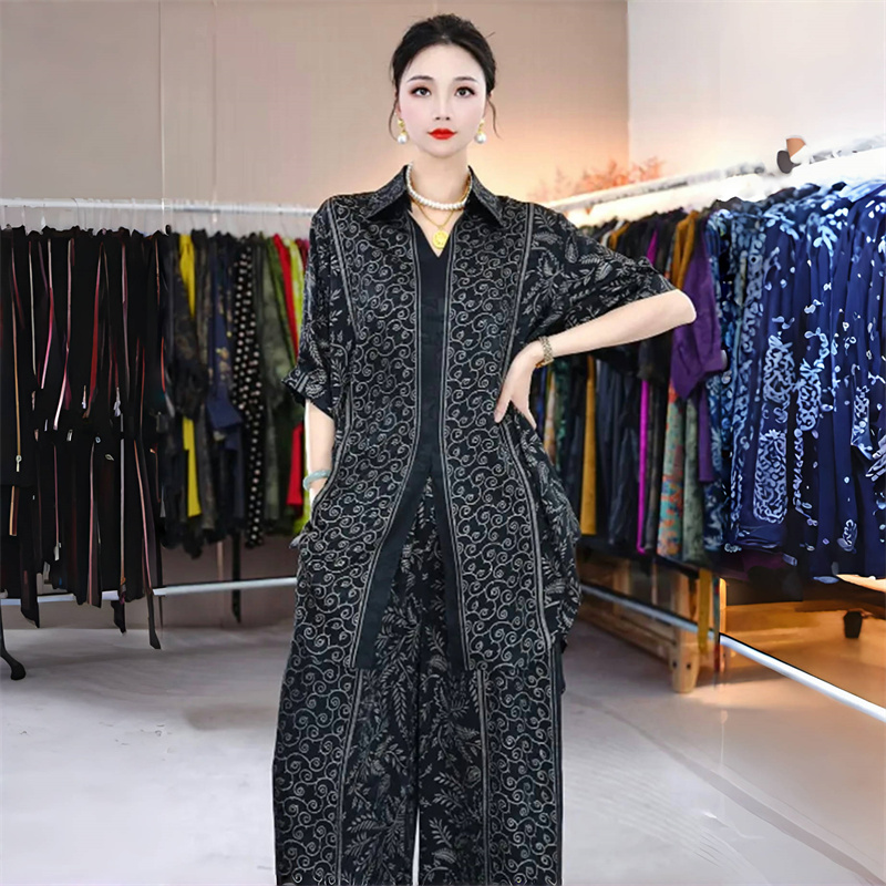 复古真丝大码长款大版衫夏季时尚气质宽松遮肉衬衫阔腿裤两件套装