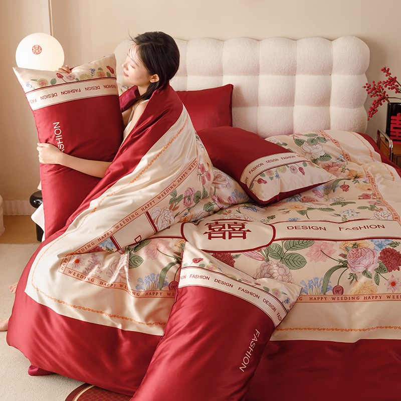 简约中式结婚四件套大红色床单被套全棉纯棉婚庆床上用品婚房喜被