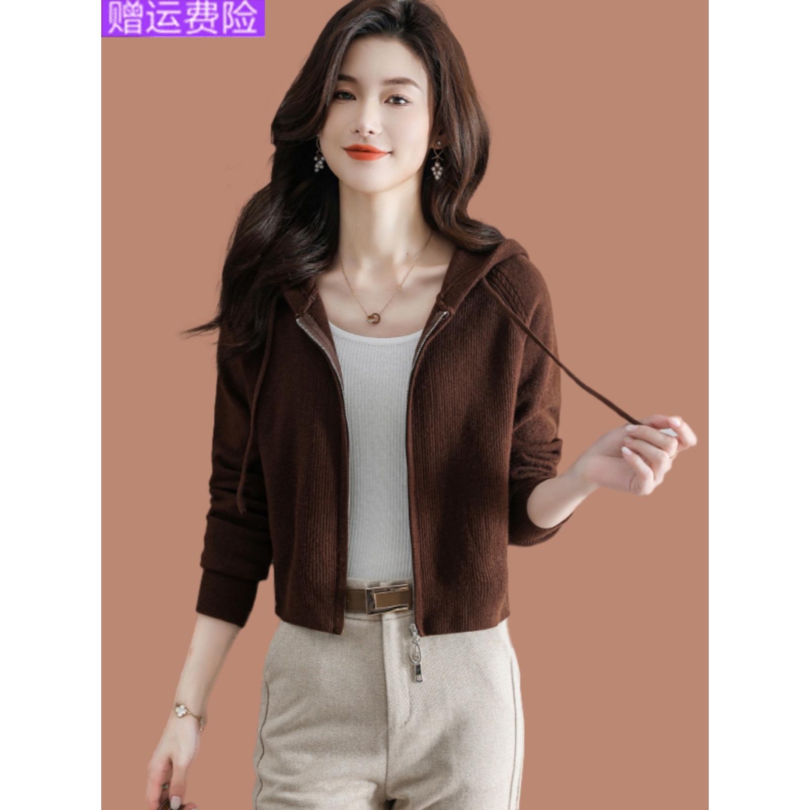 小款羊毛针织开衫女春秋外搭洋气高腰连帽上衣配裙子短款毛衣外套