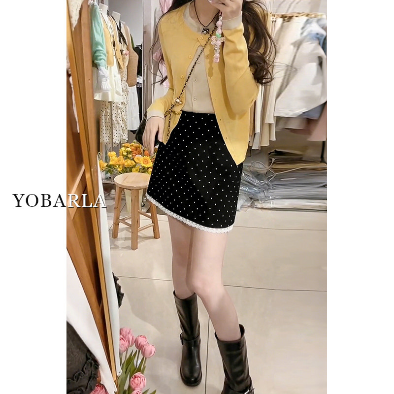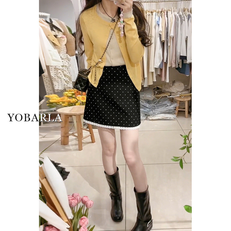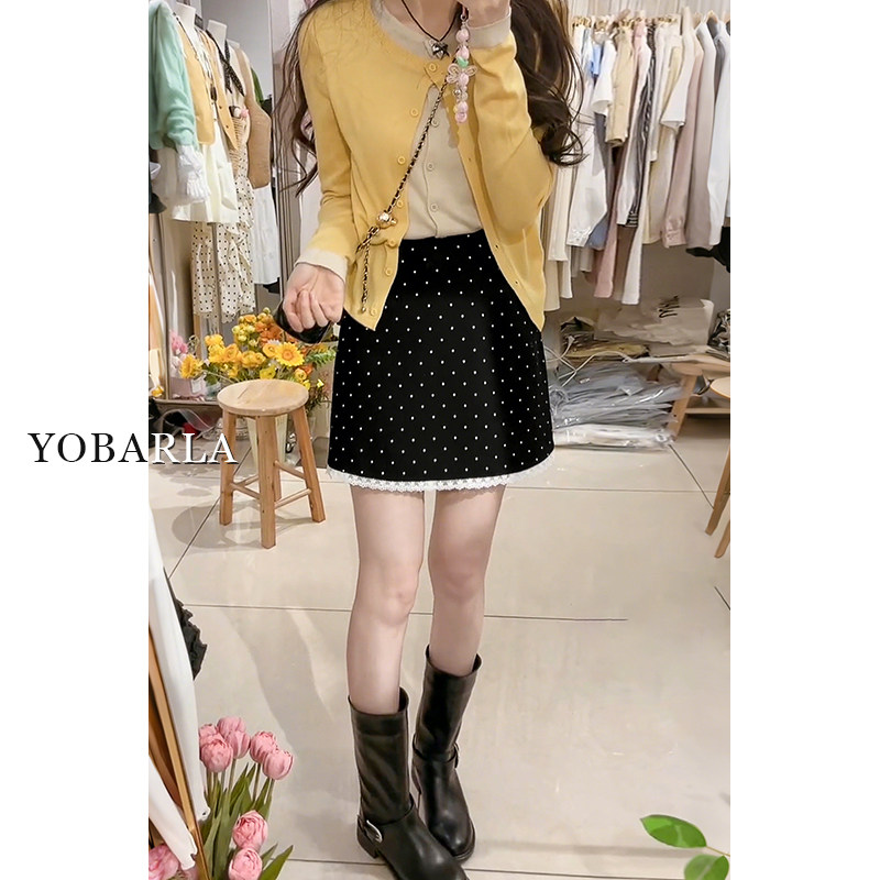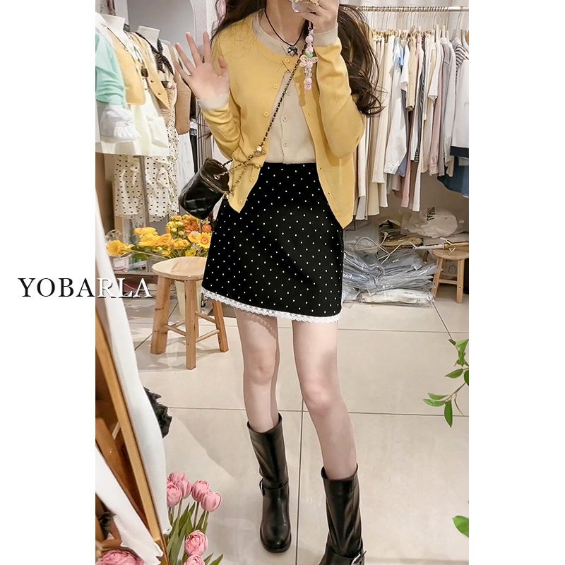 黑色波点西装短裙女高腰夏季新款大码胖mm显瘦蕾丝拼接a字半身裙