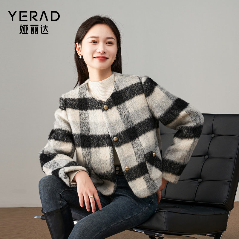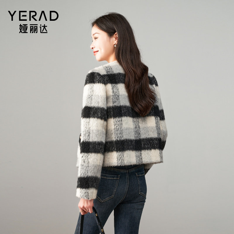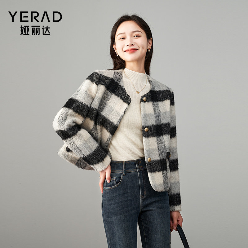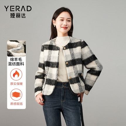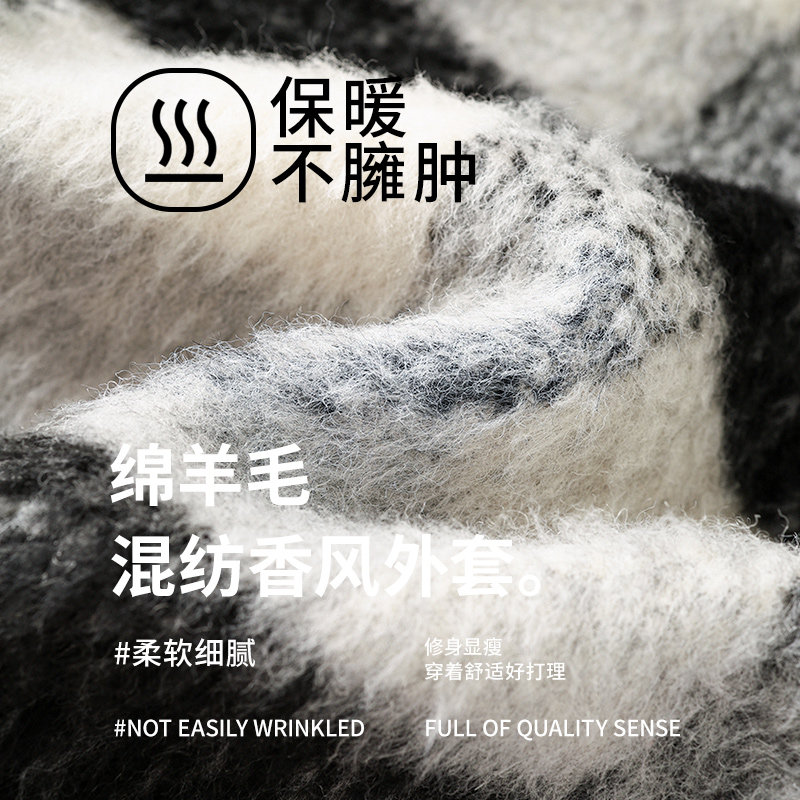 娅丽达设计感复古黑白格纹小香风外套女2024秋冬新款加厚短款上衣