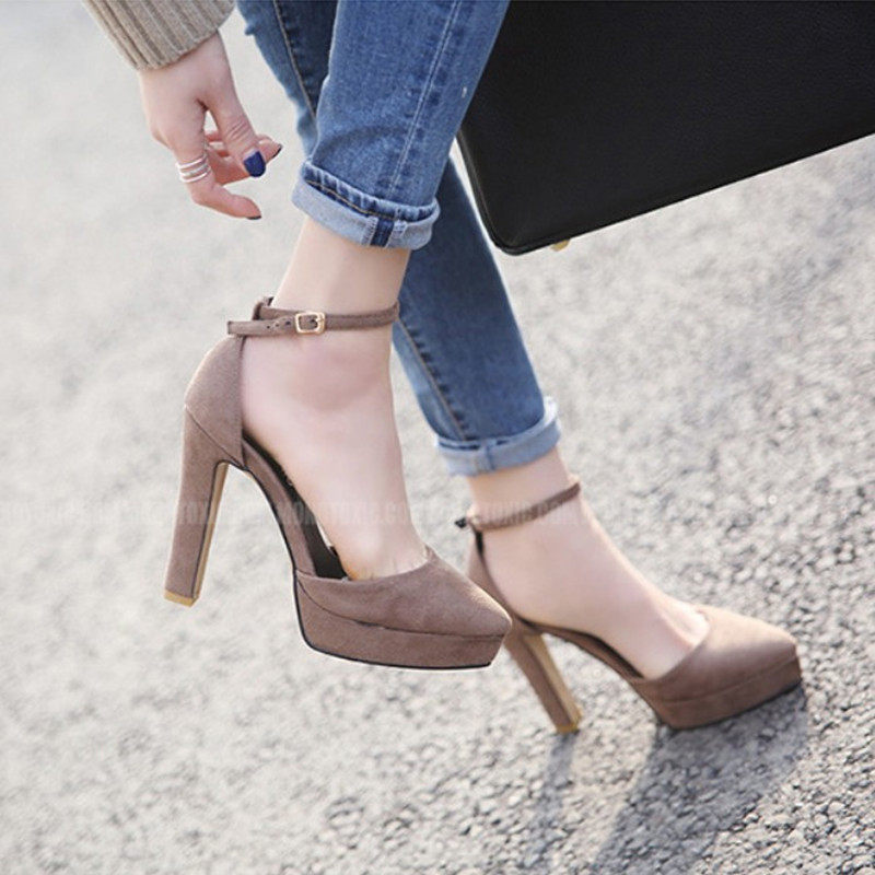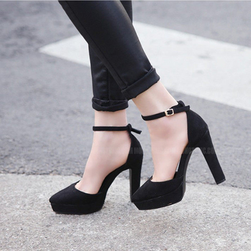 超高跟女鞋尖头11cm防水台包头中空单鞋一字扣带粗跟学生艺考凉鞋