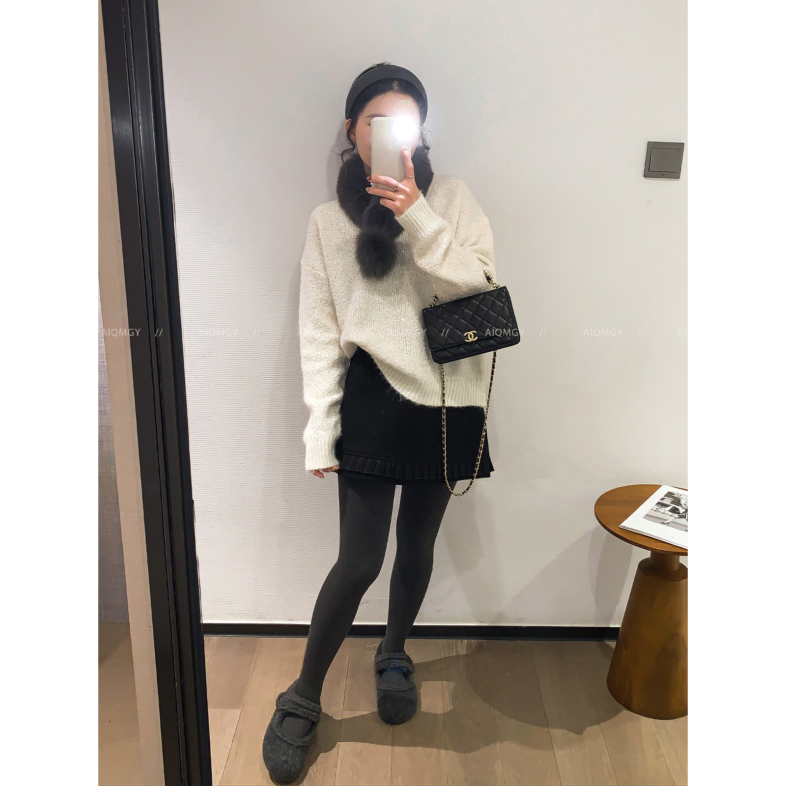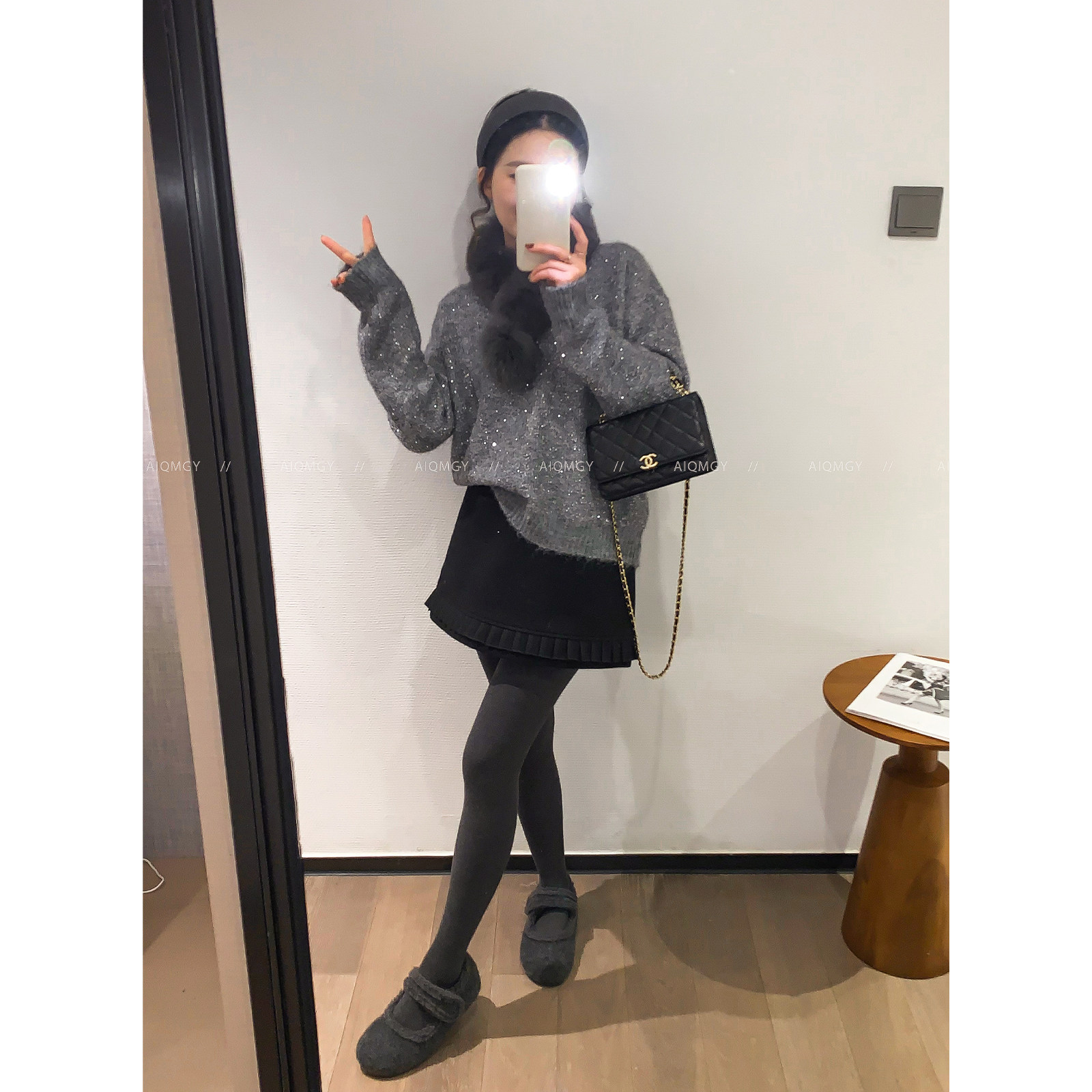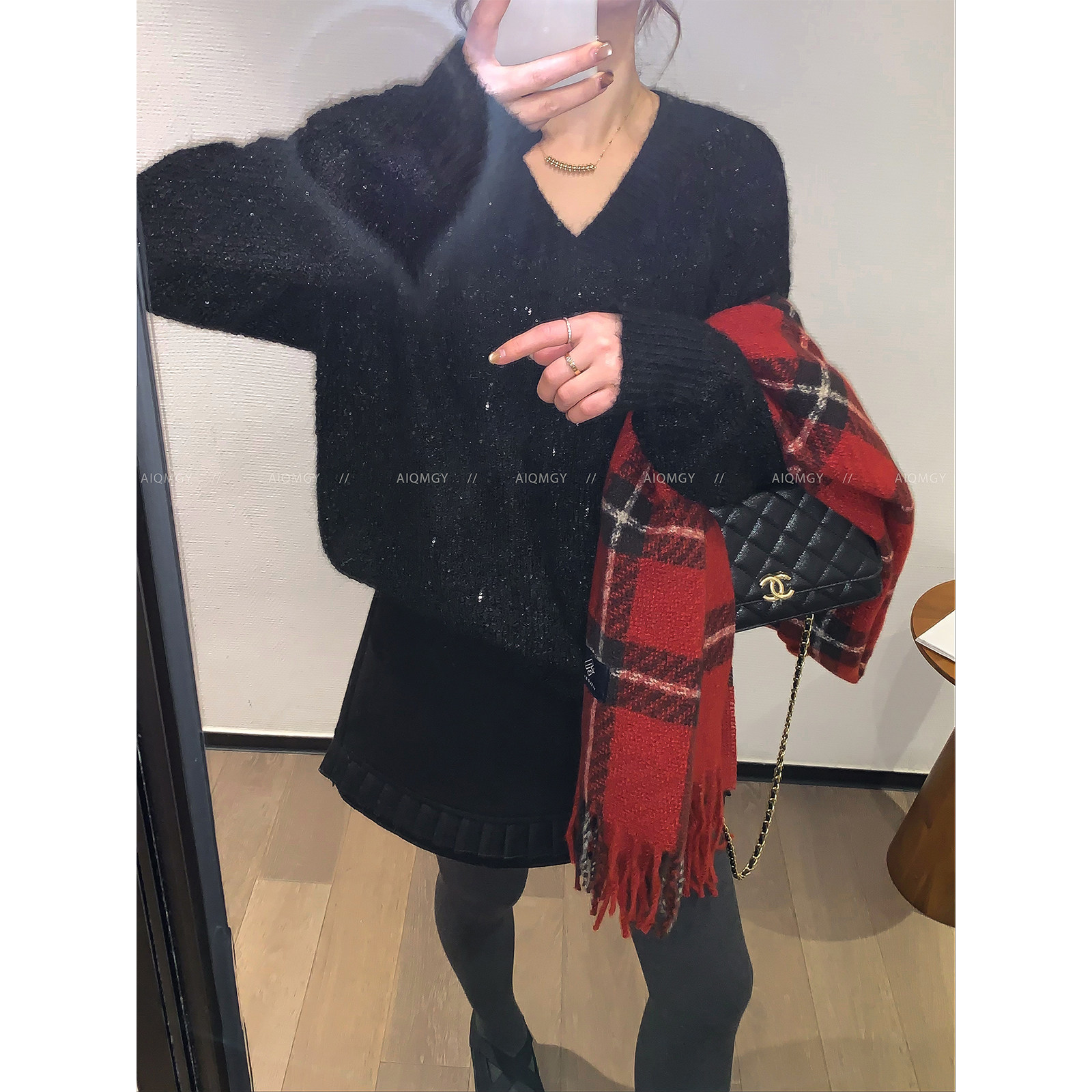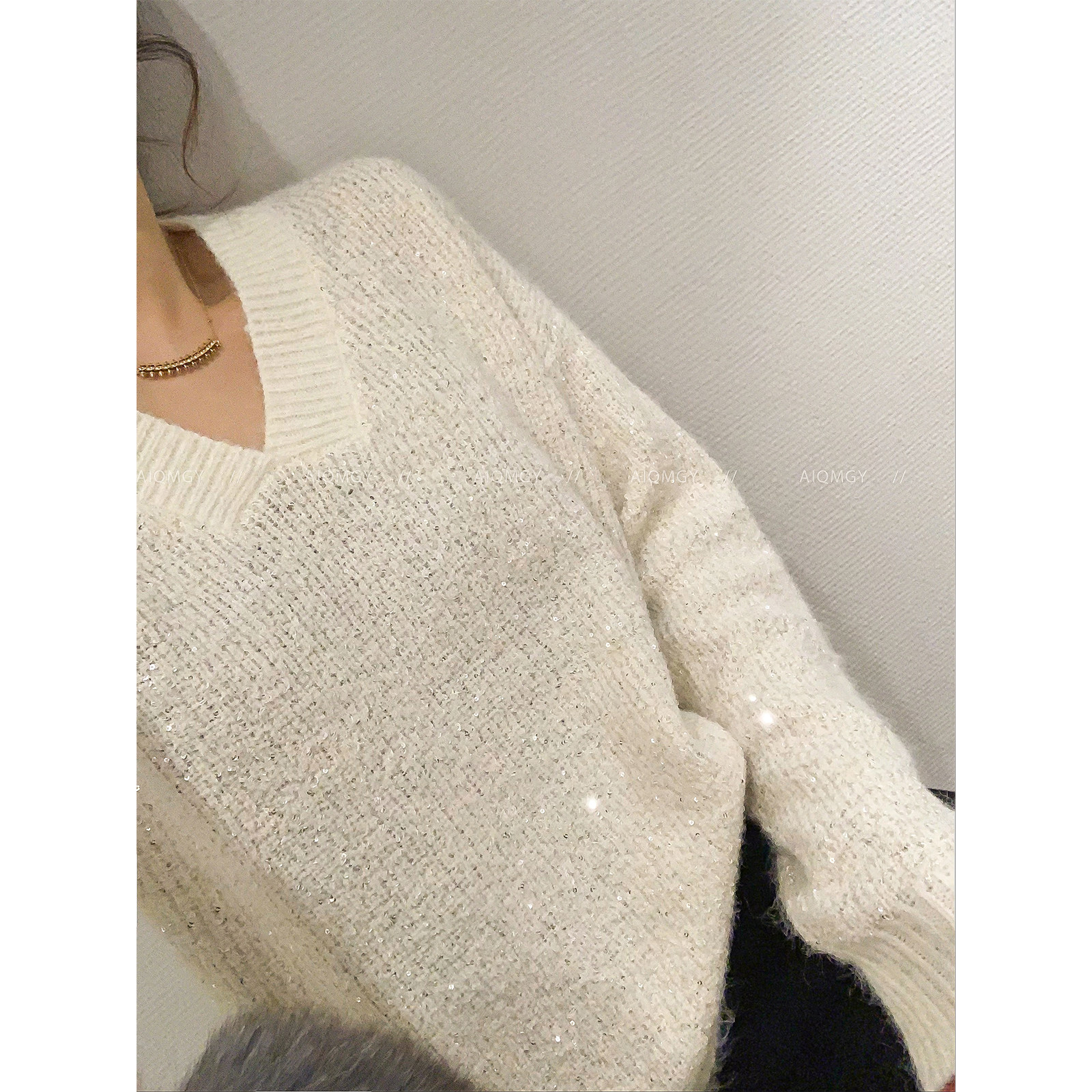 爱情魔鬼鱼 V领套头亮片毛衣女2025冬季新款时尚宽松百搭针织上衣