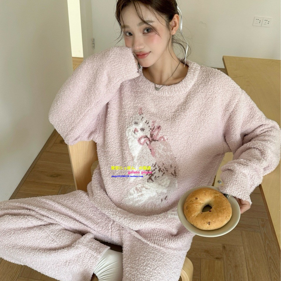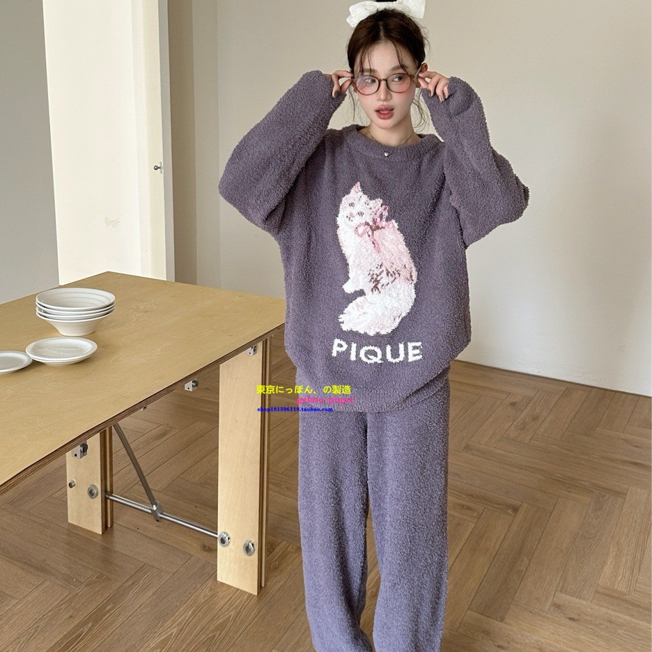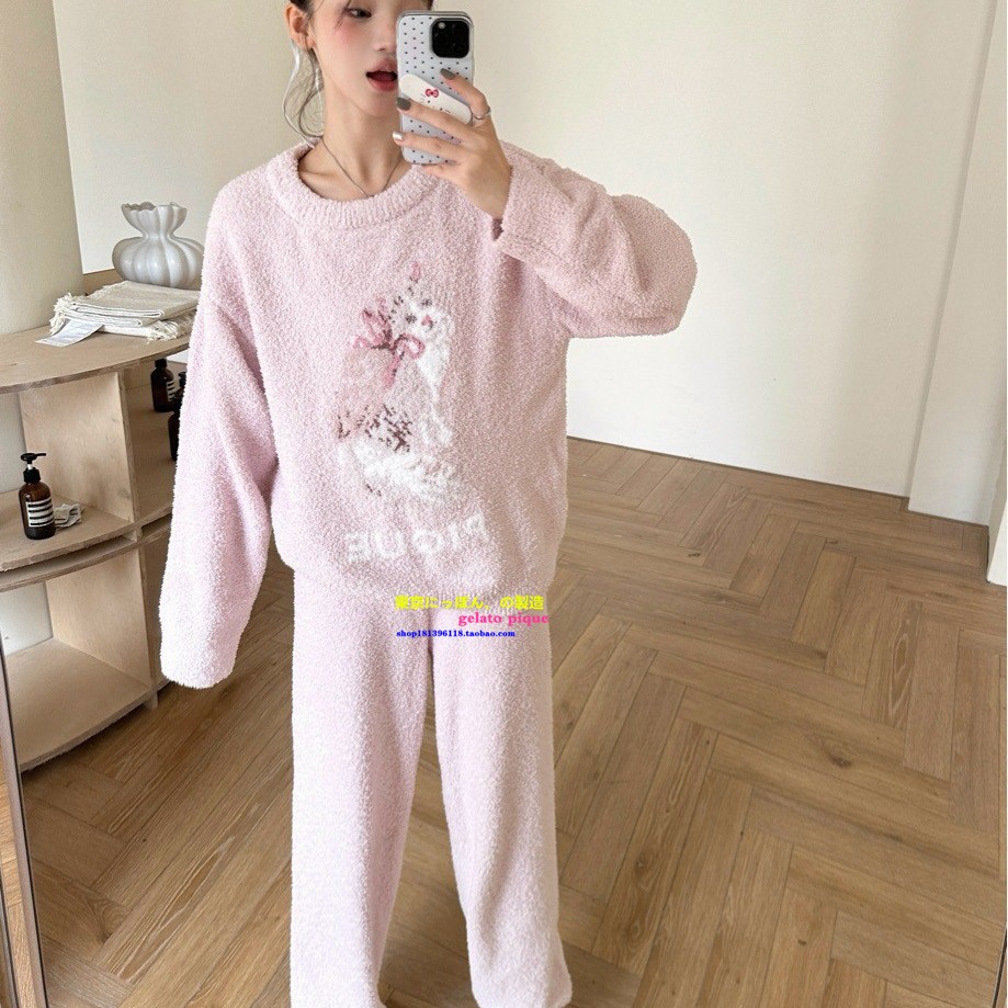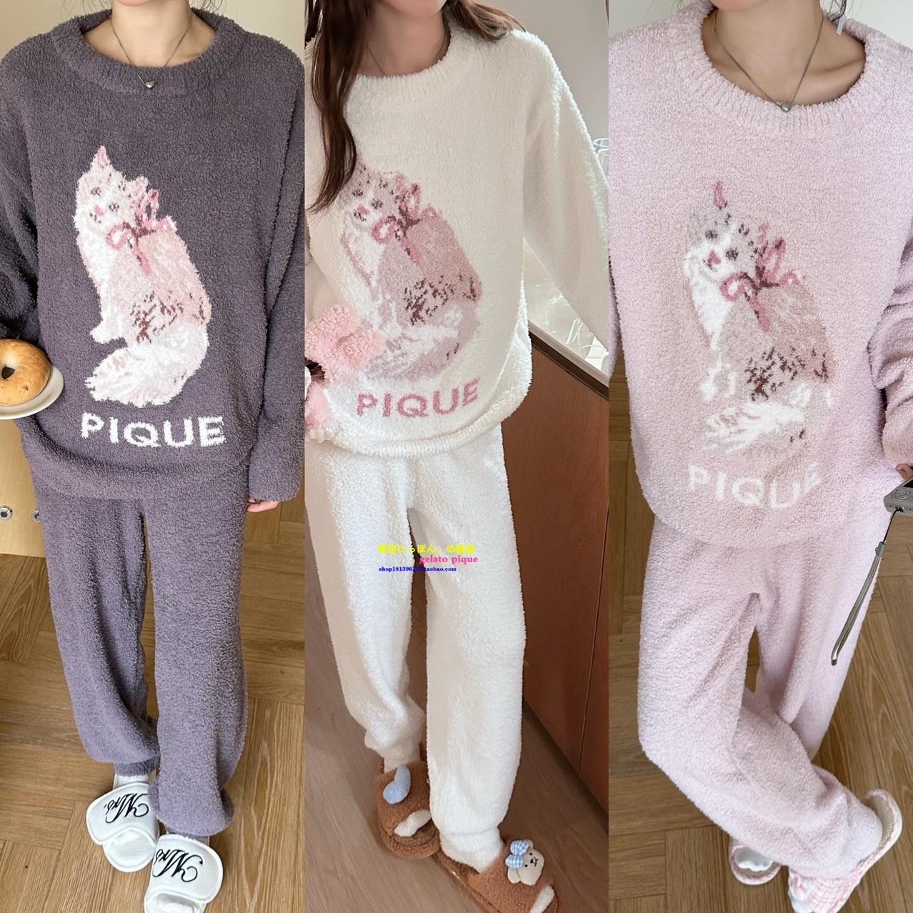 日本GP gelato pique冬季新款软绵绵保暖睡衣可爱猫咪家居服套装