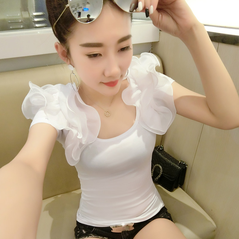夏季女装新款雪纺木耳边T恤女短袖修身露背泡泡袖打底衫百搭上衣