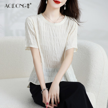 新款真丝上衣女短袖桑蚕丝T恤清新纯色简约设计时尚显瘦小衫夏季