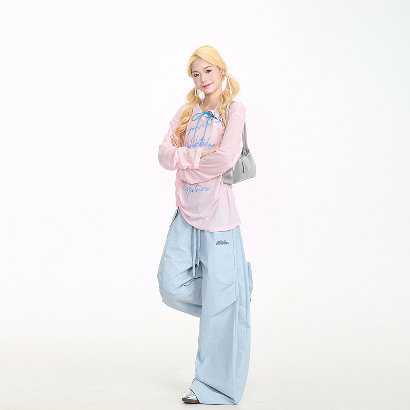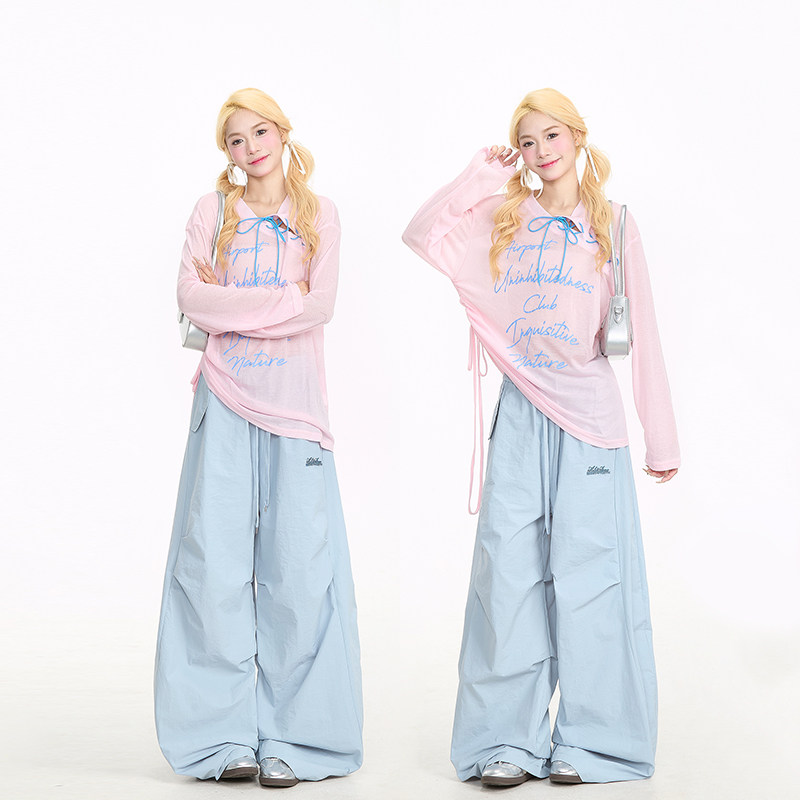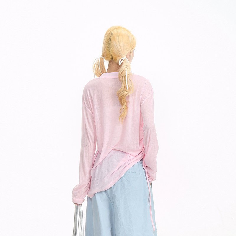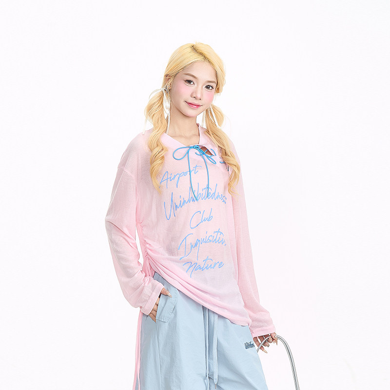 NERESUM粉色长袖罩衫女甜辣字母印花绑带设计感新款微透T恤上衣