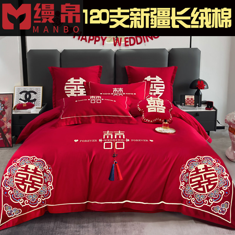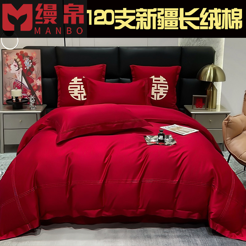 中式婚庆四件套120支长绒棉大红色全棉刺绣结婚被套床单床上用品4