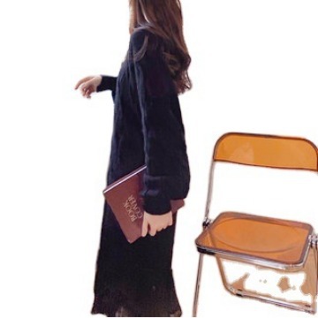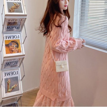 女装韩版2022新款春秋宽松百搭中长款蕾丝拼接小清新针织连衣裙