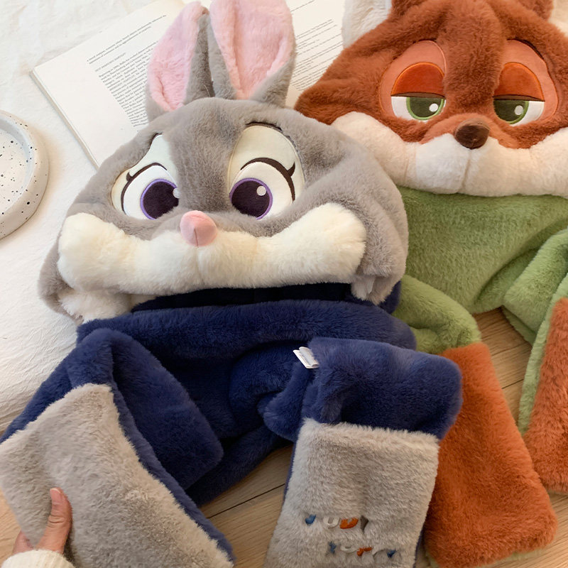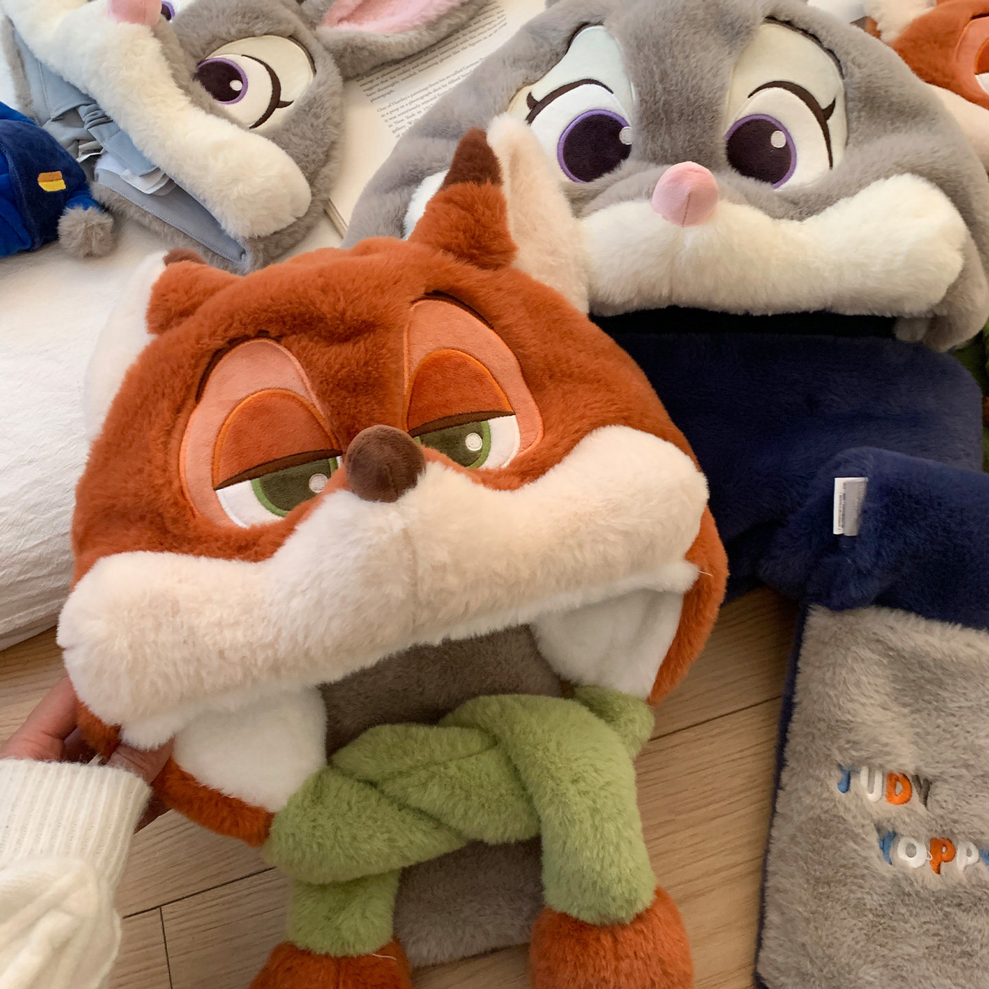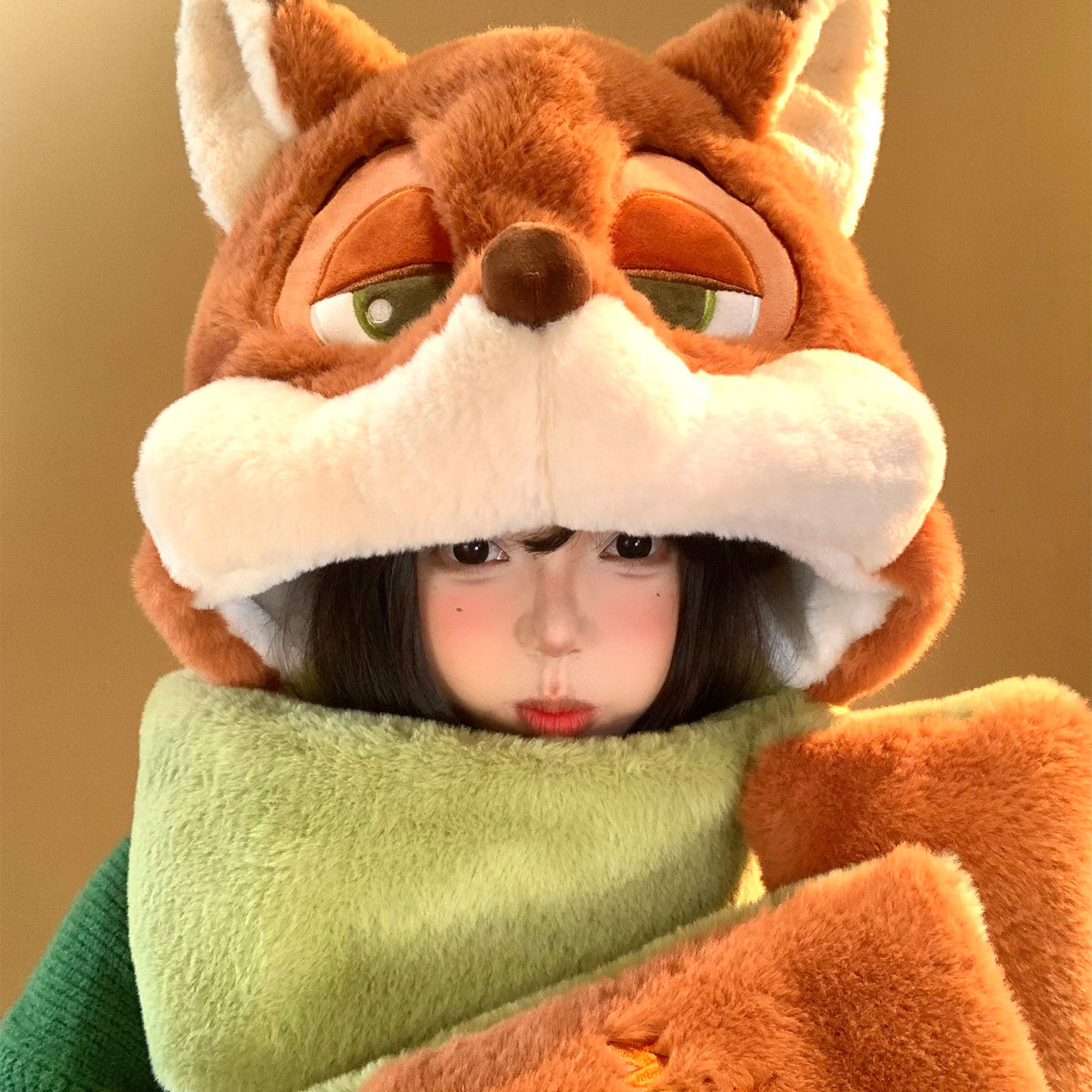 迪士尼疯狂动物城尼克毛绒帽子围巾一体女冬季保暖防寒手套三件套