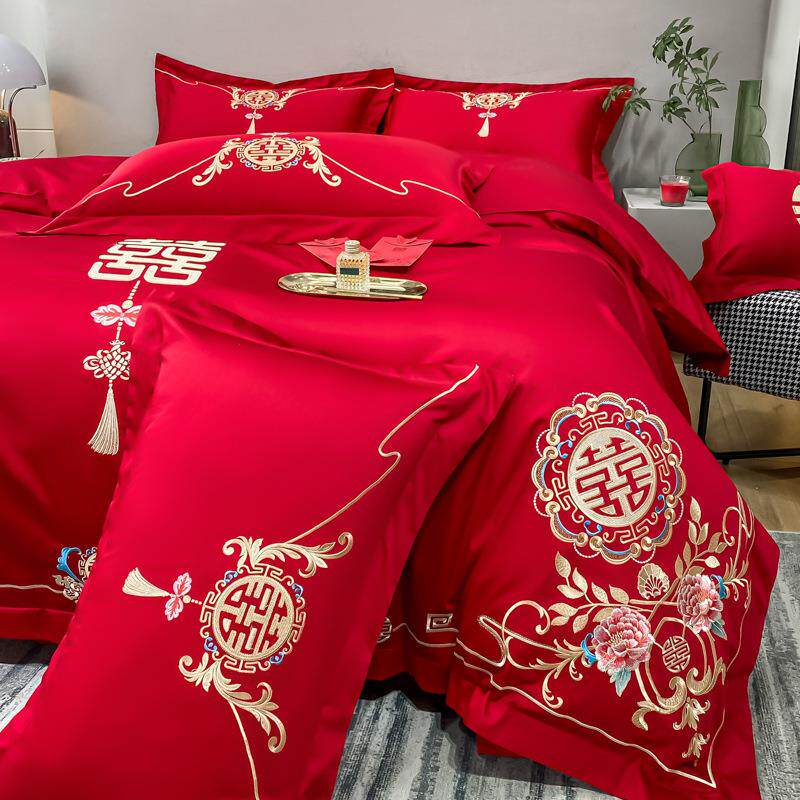高档奢华中式刺绣棉婚庆四件套大红色床单被套结婚床上用品婚嫁