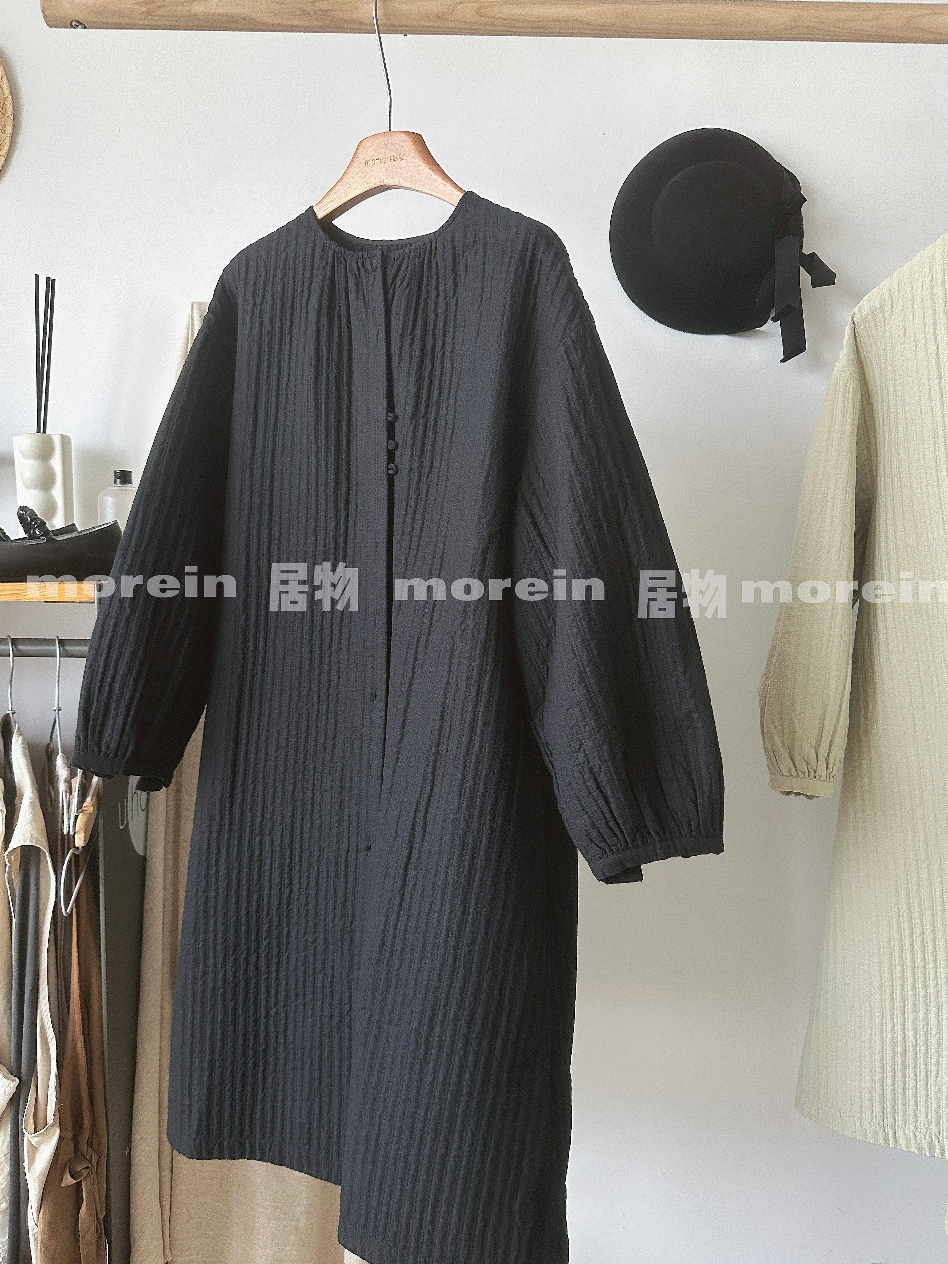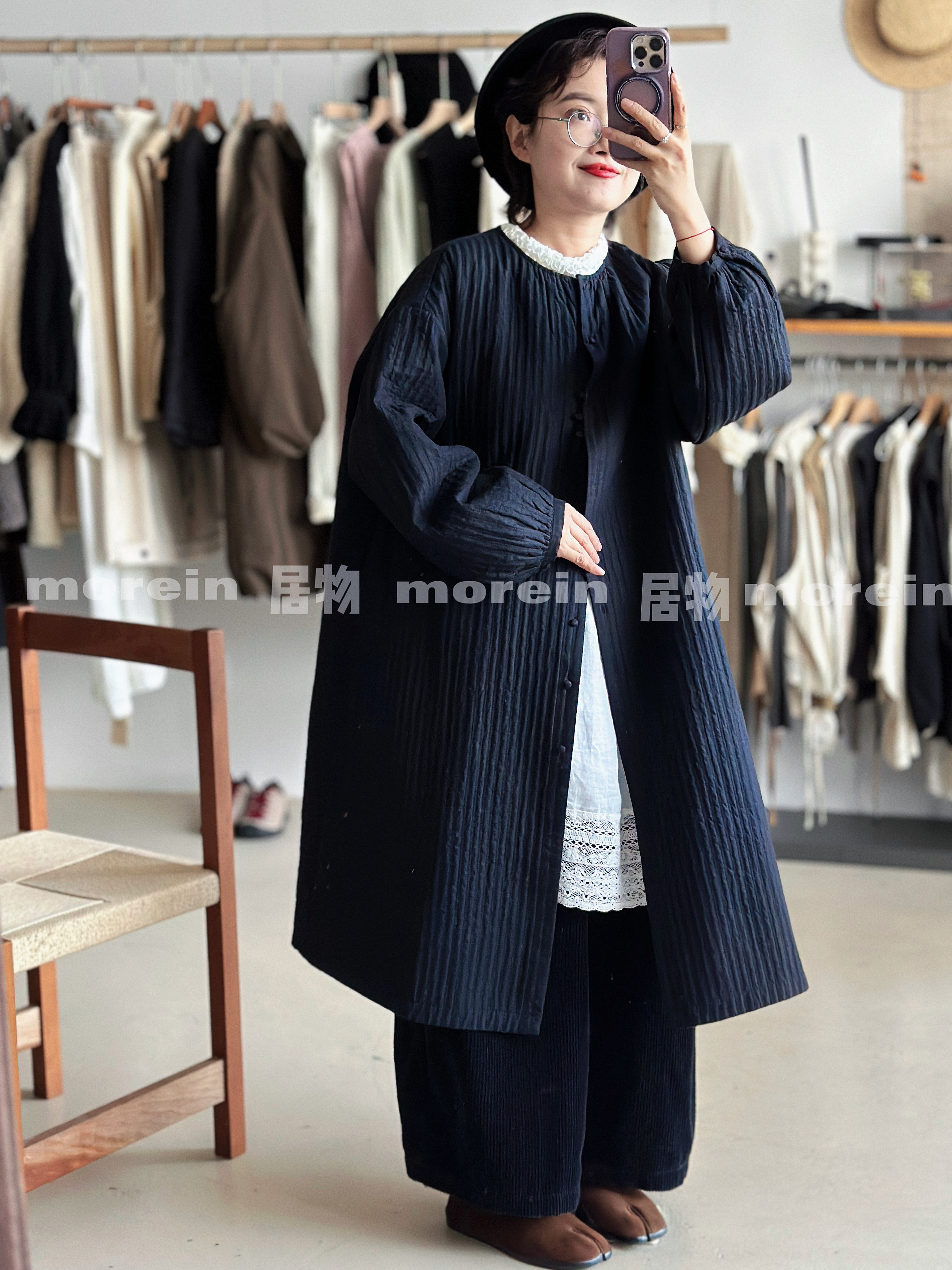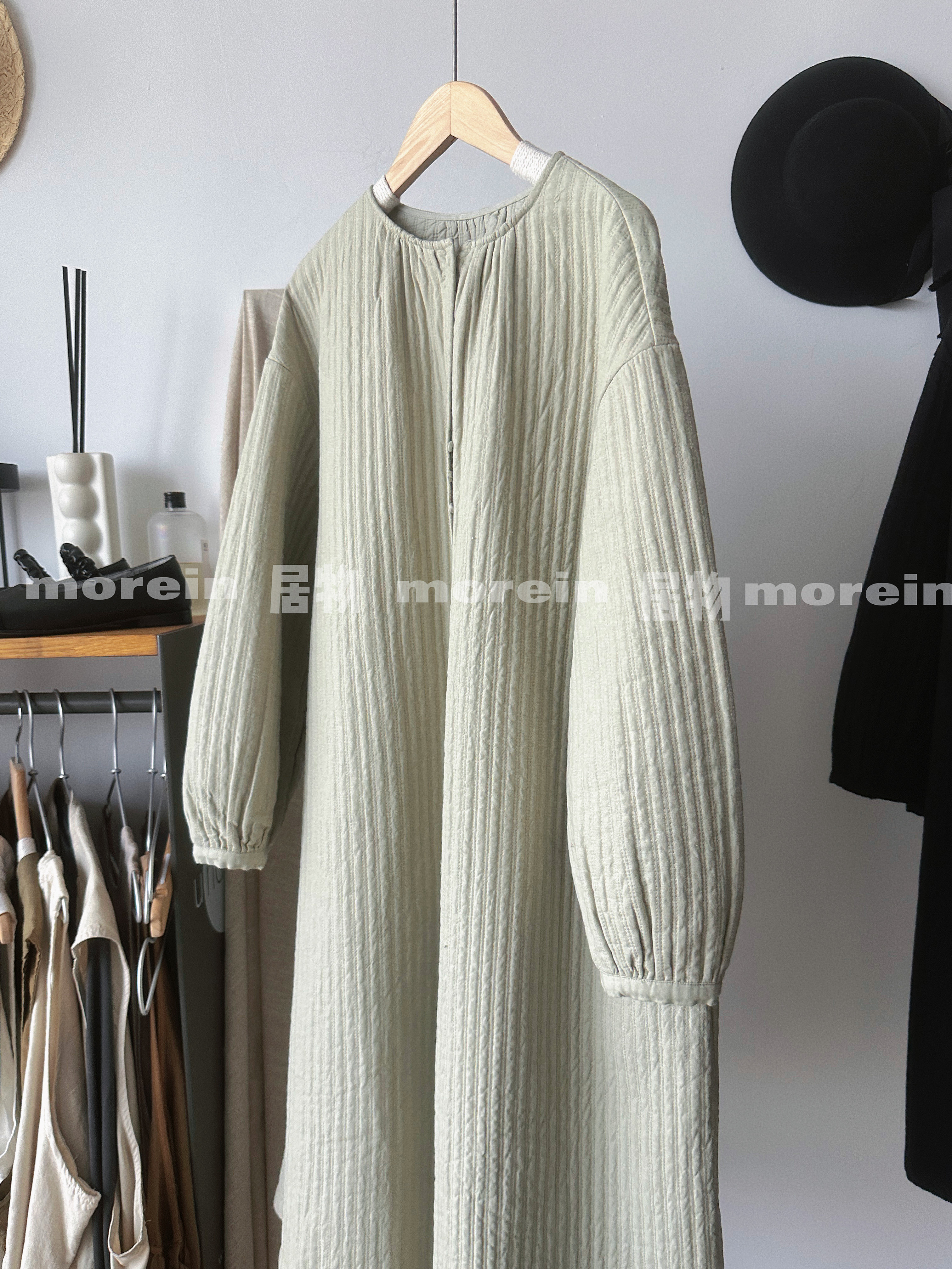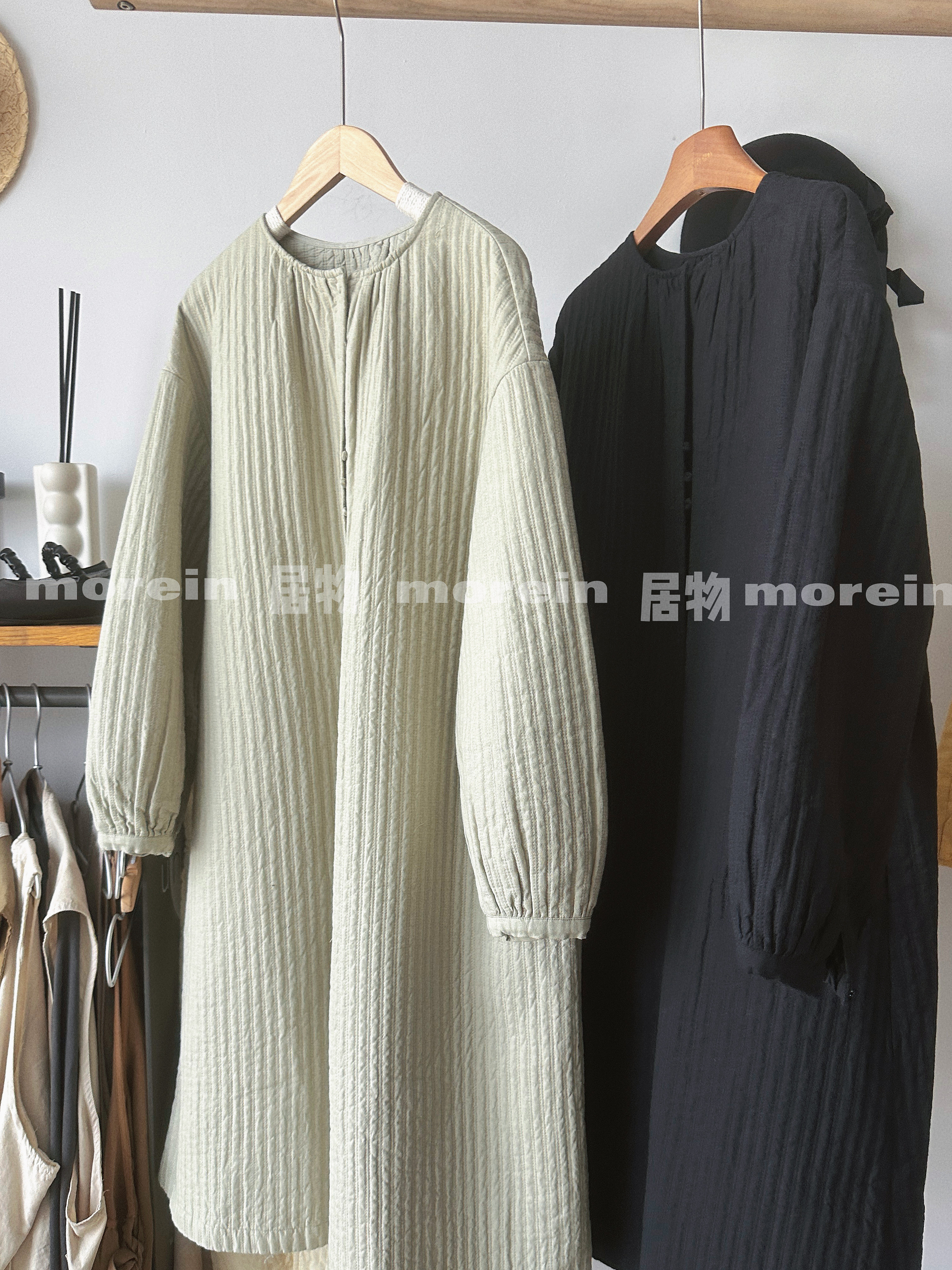 morein秋冬复古文艺松弛感长款棉麻绗缝棉连衣裙外套