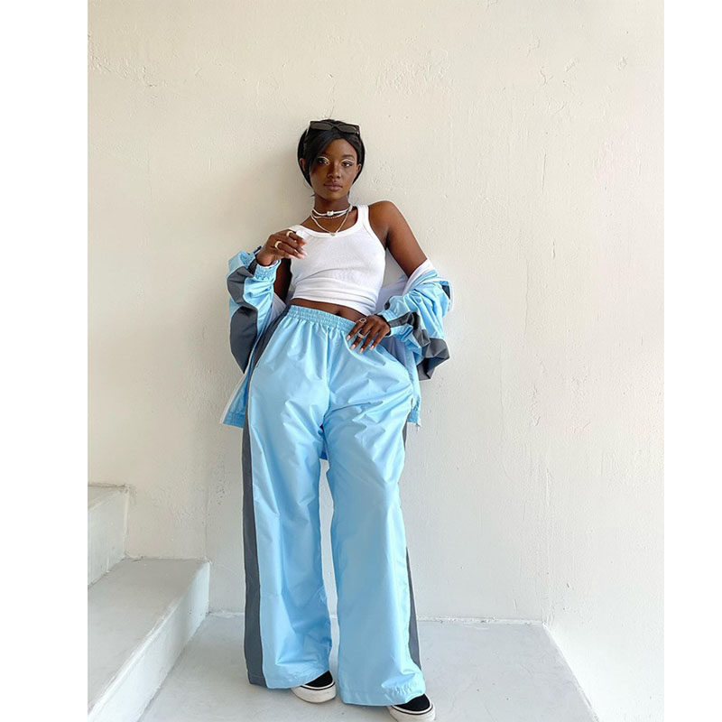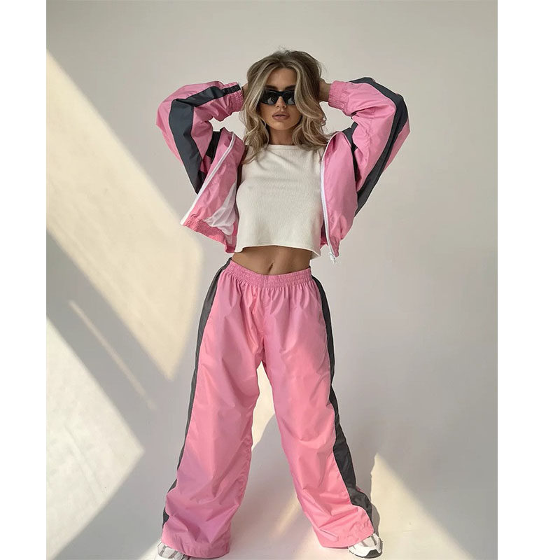 欧美女士时尚宽松拼色长袖拉链开衫撞色上衣长裤运动休闲套装suit