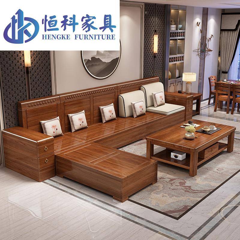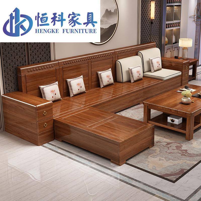 新中式胡桃木全实木沙发木质冬夏两用可拆洗高箱储物客厅组合沙发