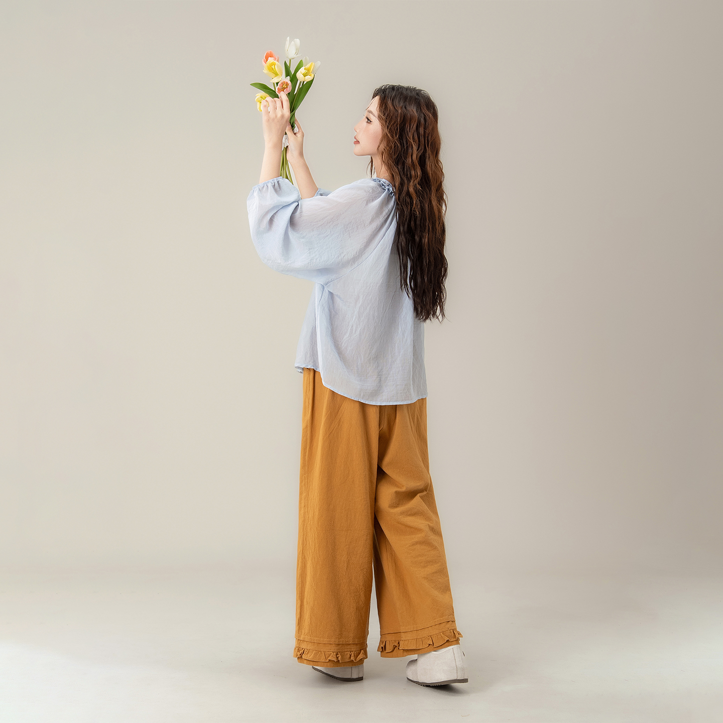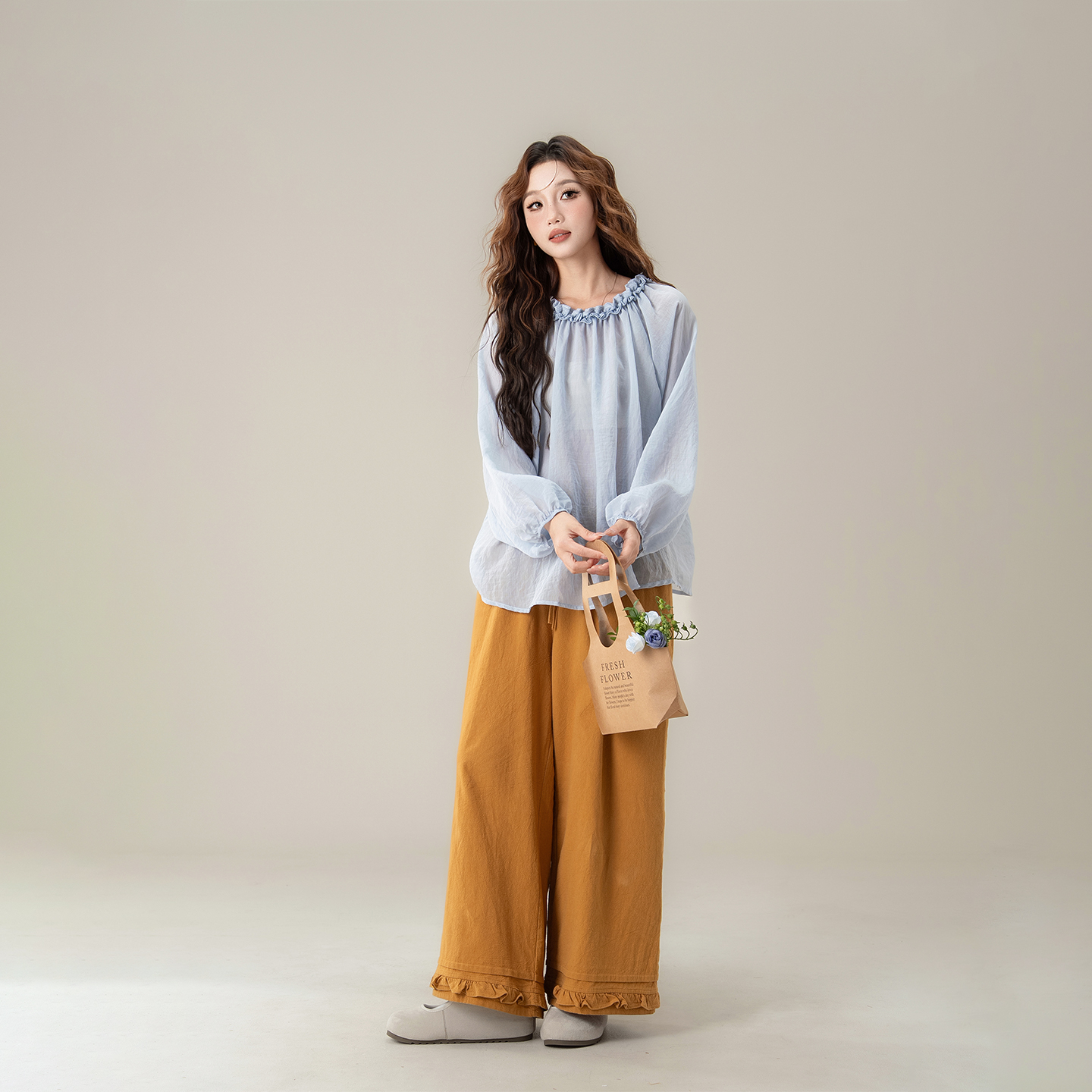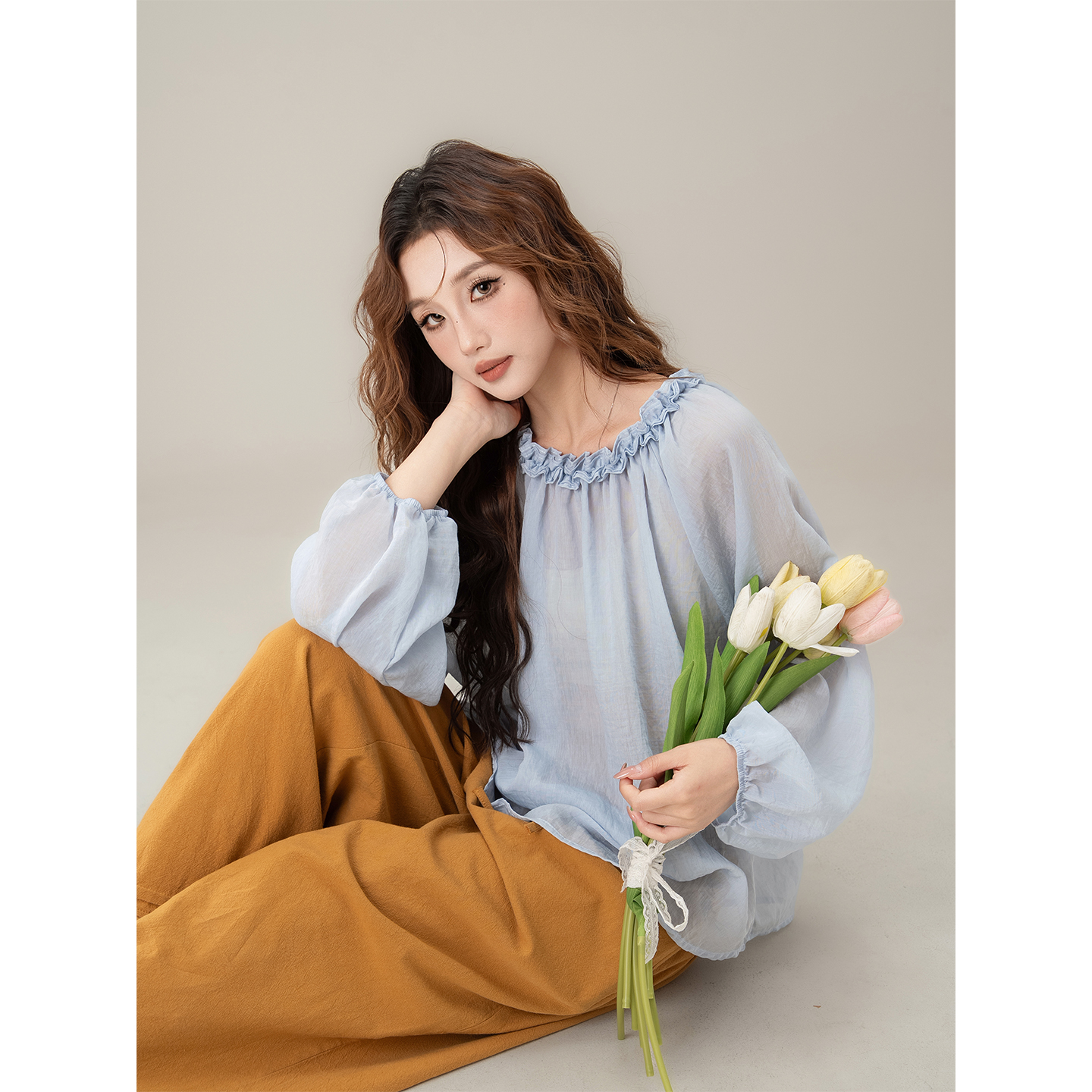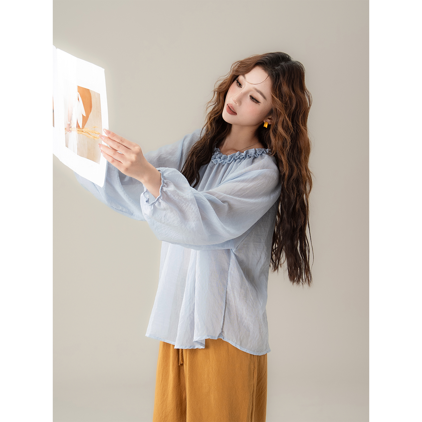 蓝色花边领长袖衬衫女2025秋季