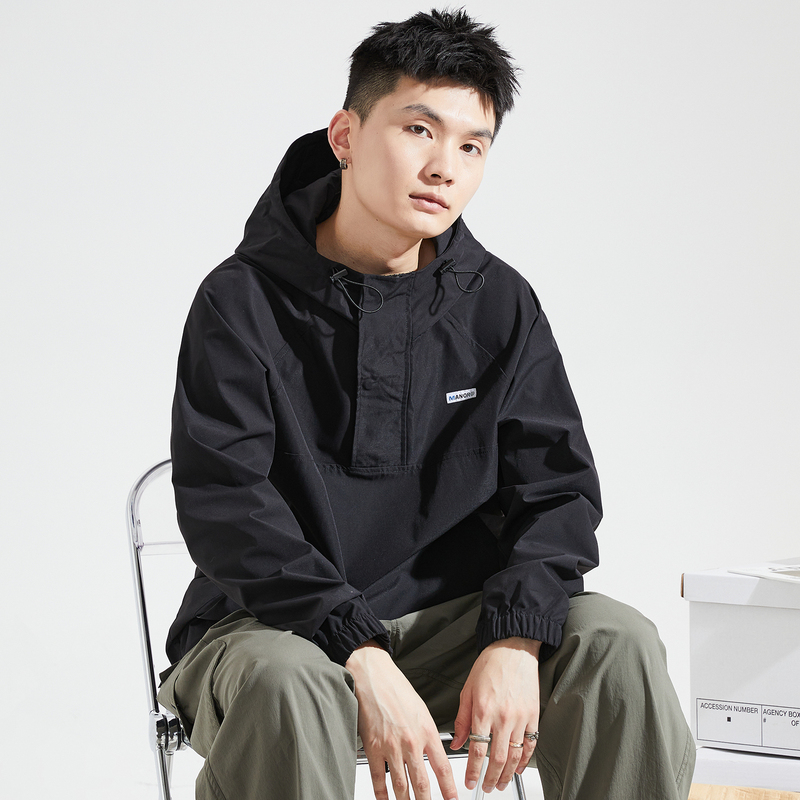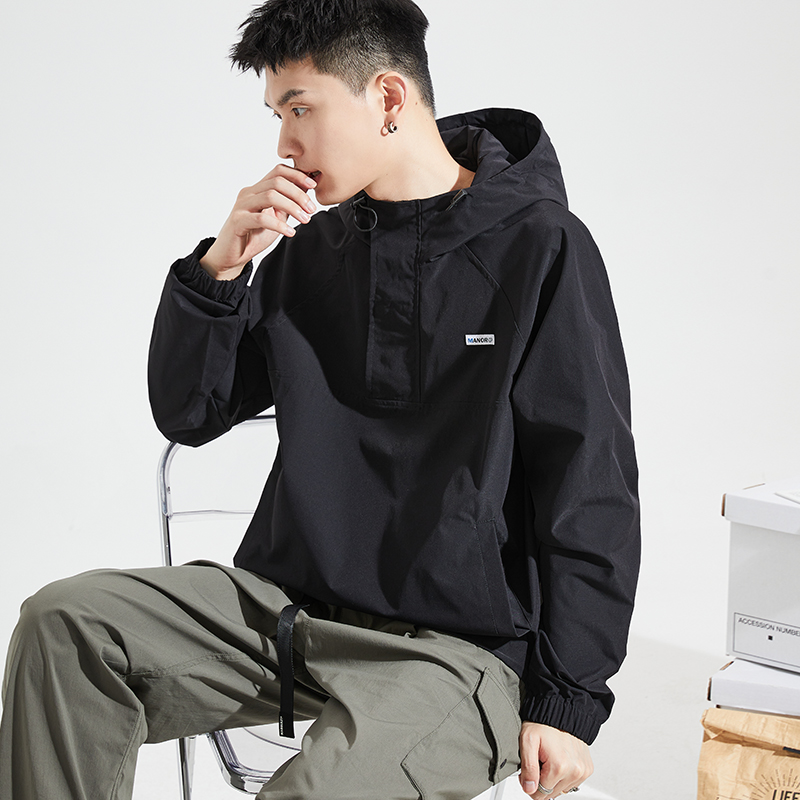 唐狮春秋季梭织拉链连帽卫衣男士宽松半开胸黑色外套美式潮运动