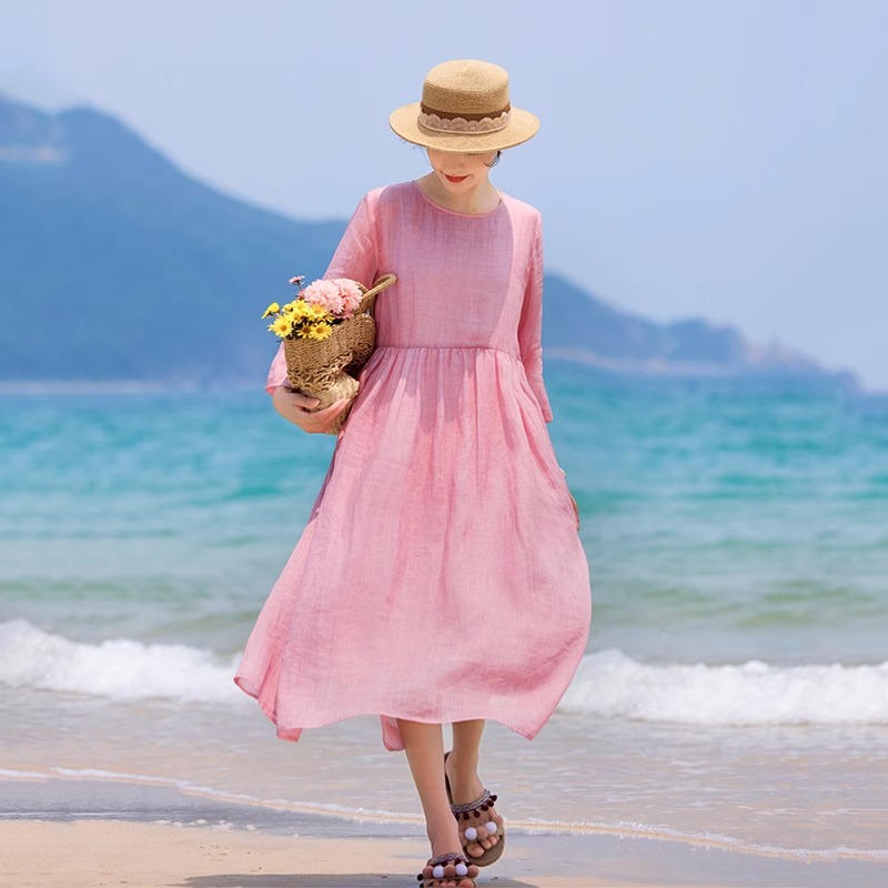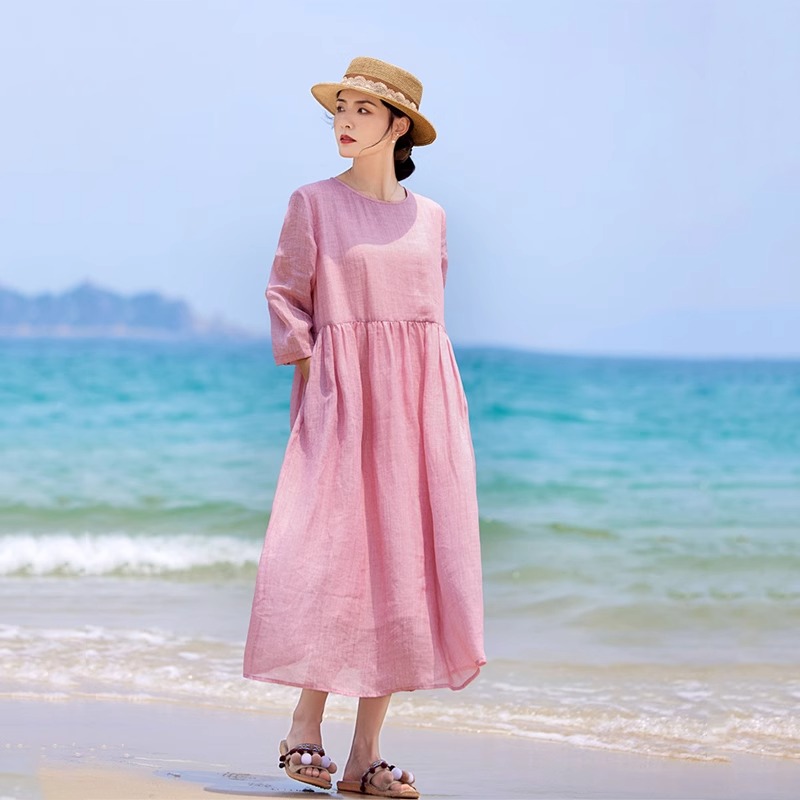 高端苎麻淡紫色圆领文艺女装大码宽松遮肚飘逸棉麻大摆连衣裙长裙