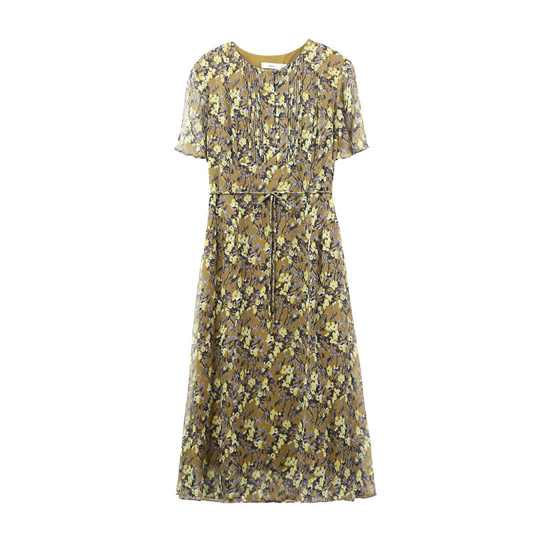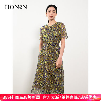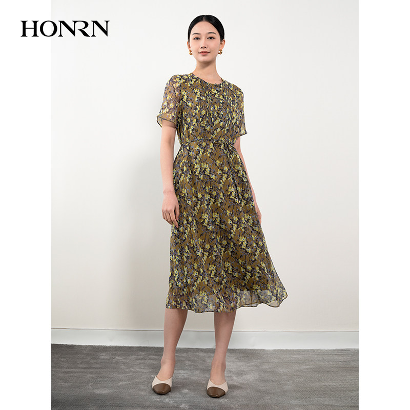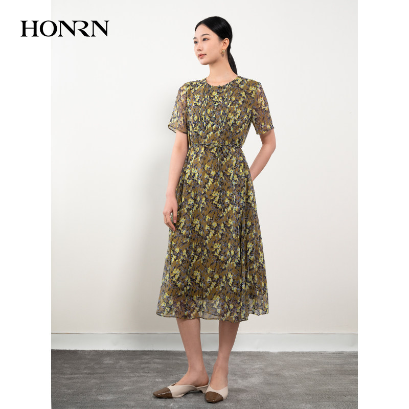 HONRN/红人桑蚕丝真丝印花裙系带收腰显瘦a字连衣裙女夏HH22OL768