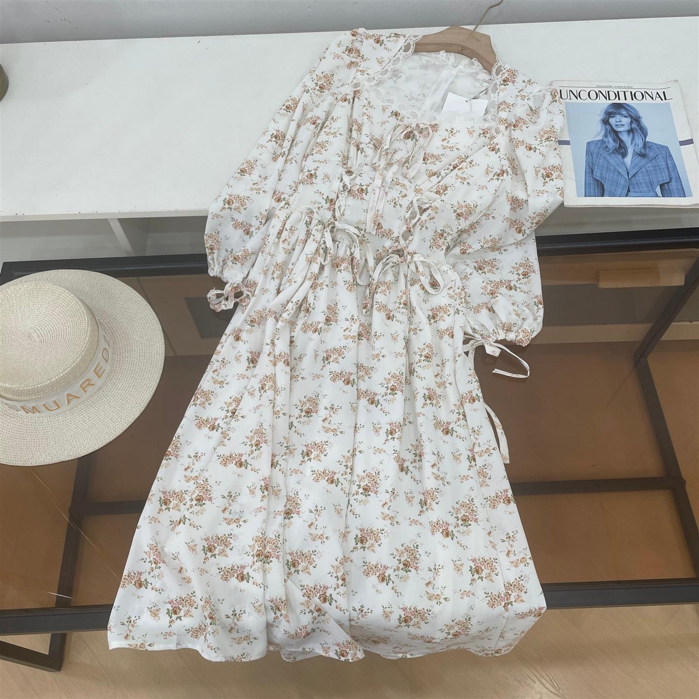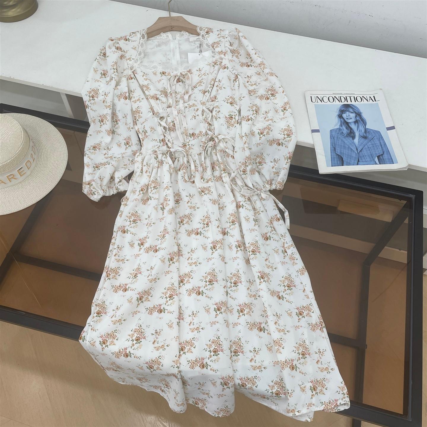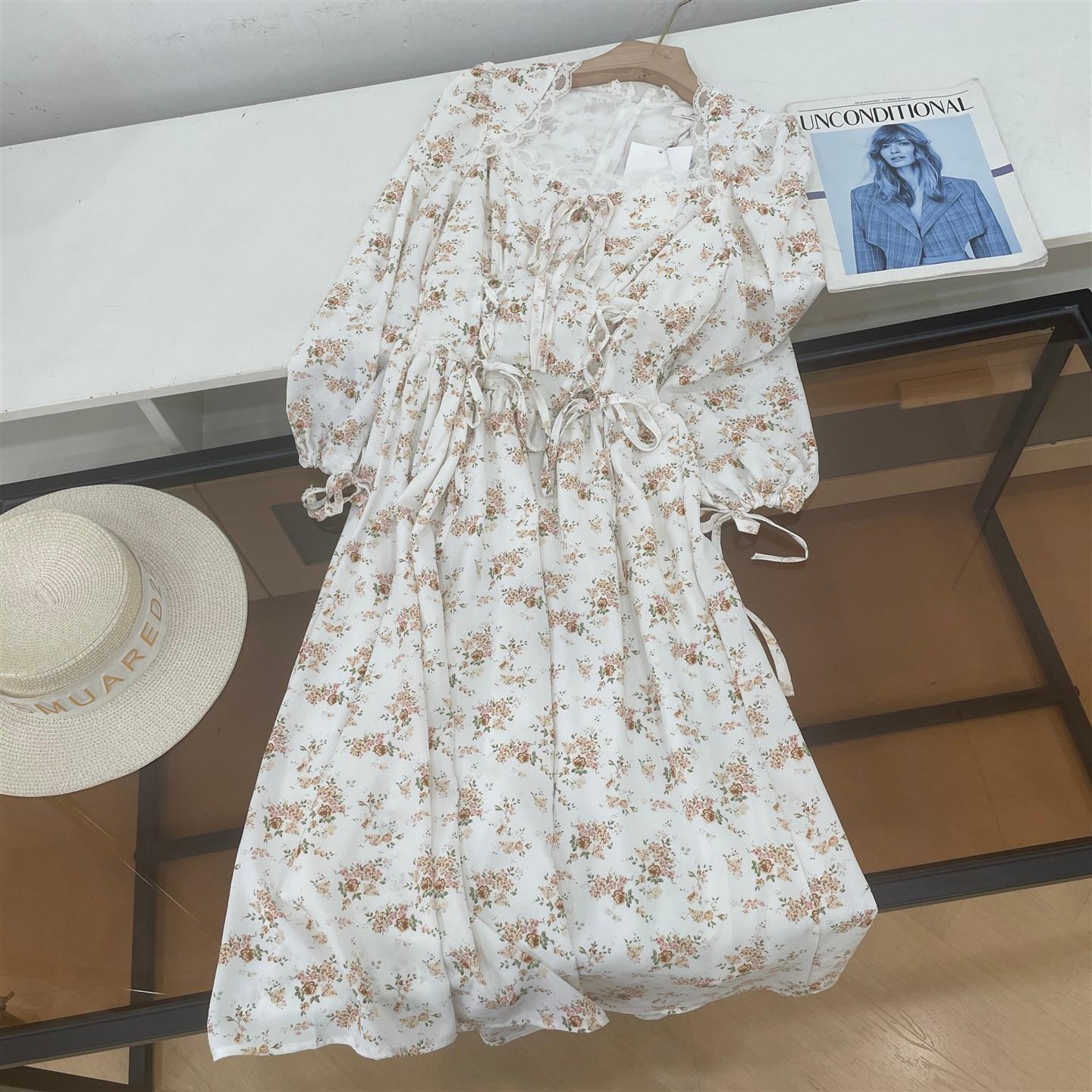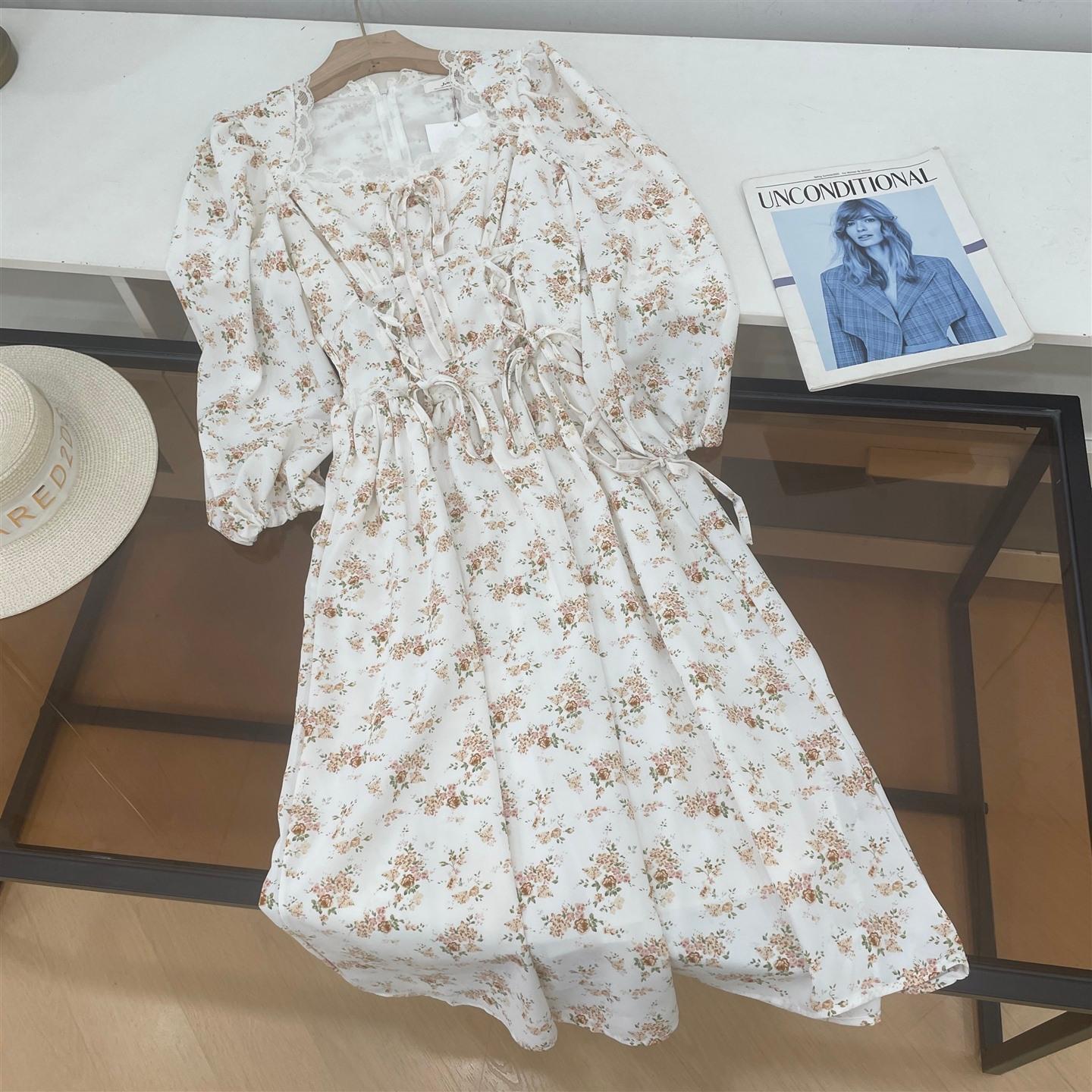 夏季新款法式气质减龄抽绳收腰修身显瘦碎花连衣裙 G#22