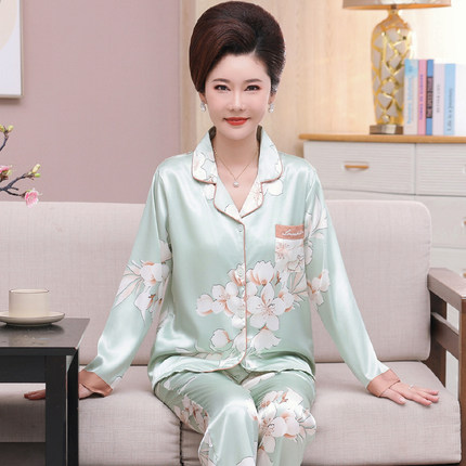 妈妈睡衣冰丝春夏季薄款长袖休闲
