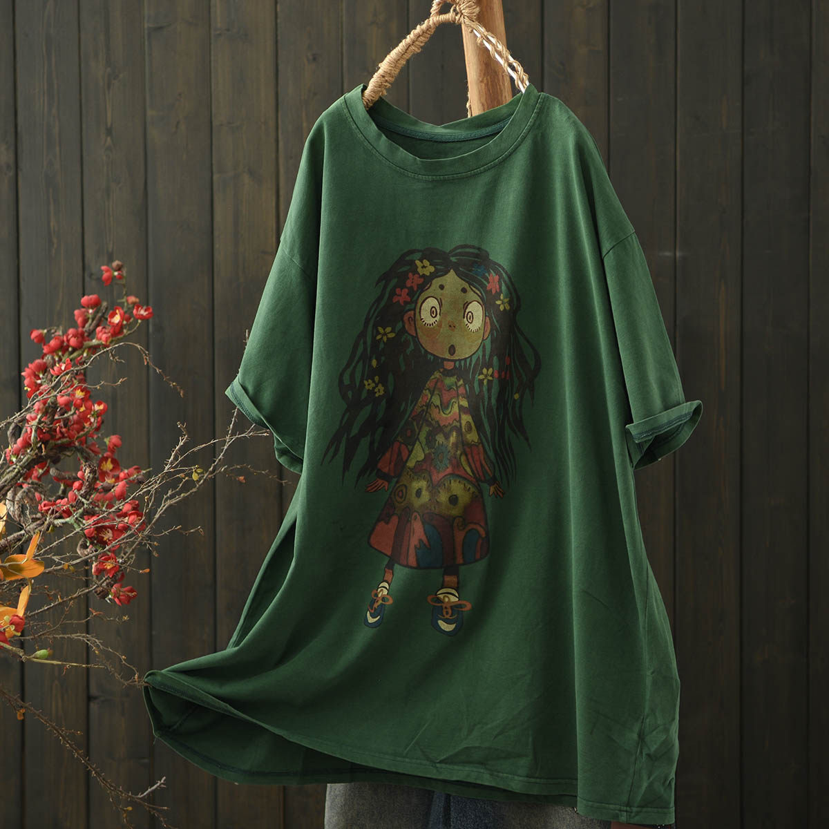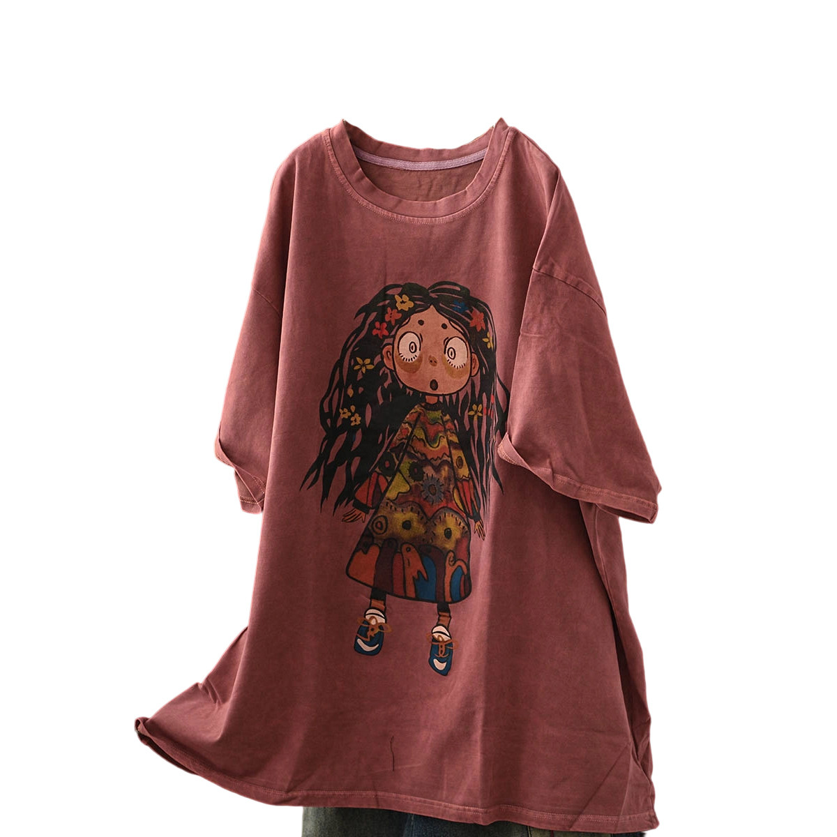 卡通女孩做旧棉质中长T恤短袖夏