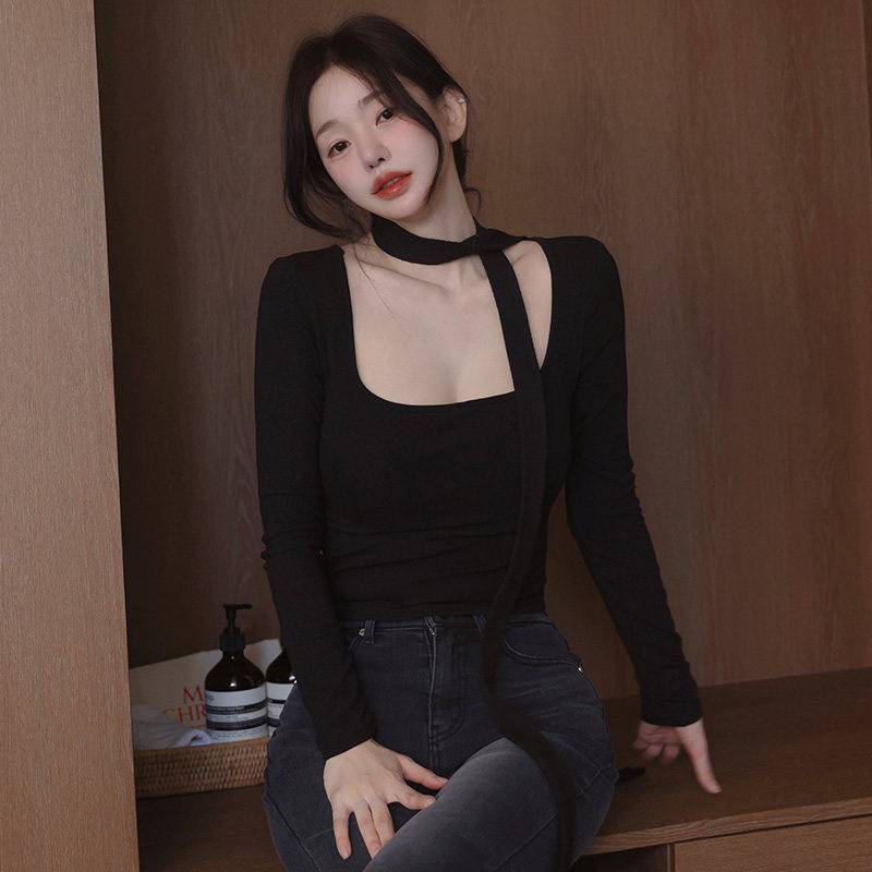 kindame韩国百搭纯色休闲丰胸侧盖修身露脐长袖T恤TL24F2908