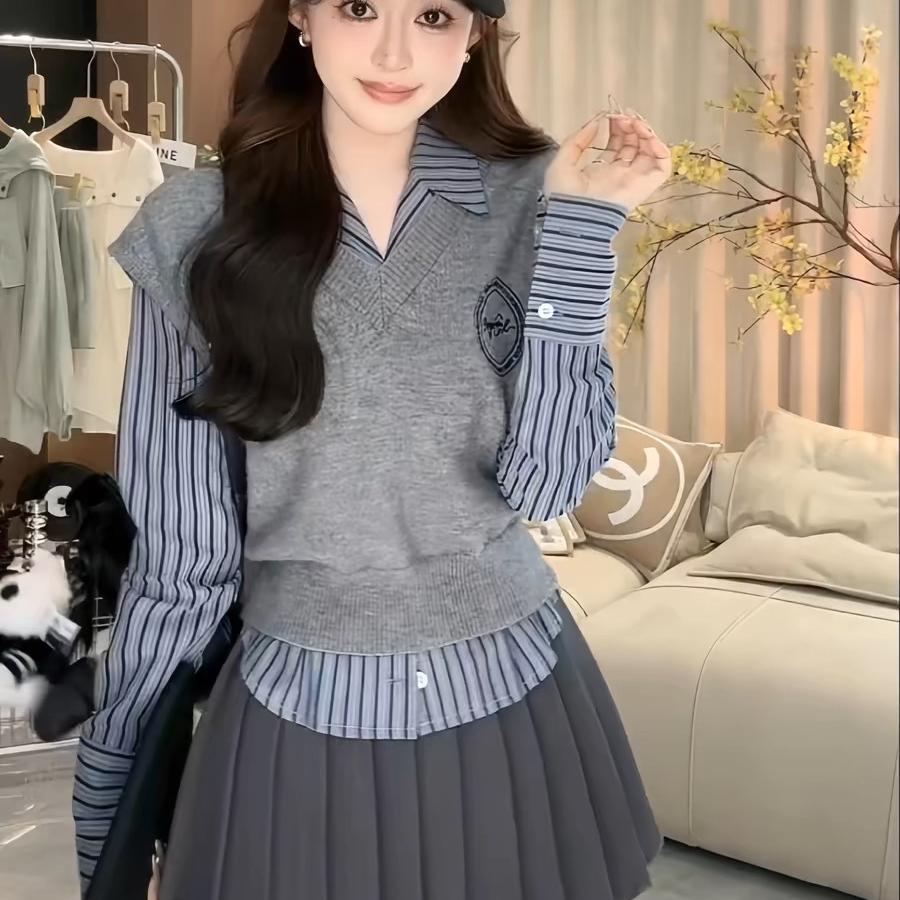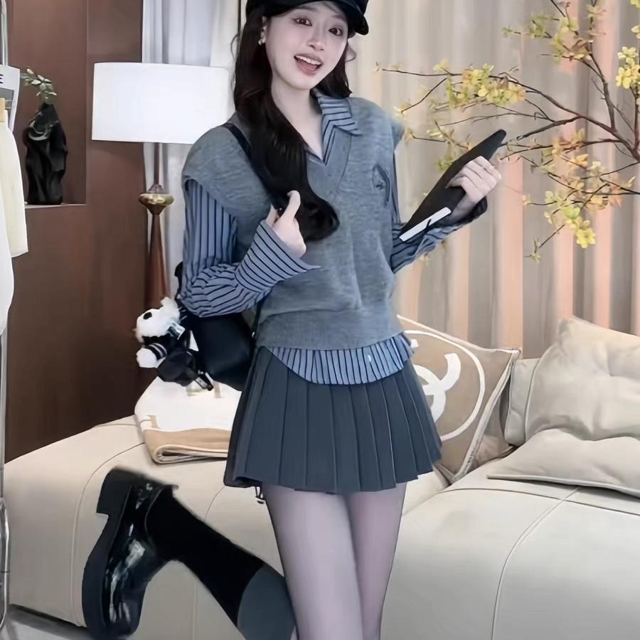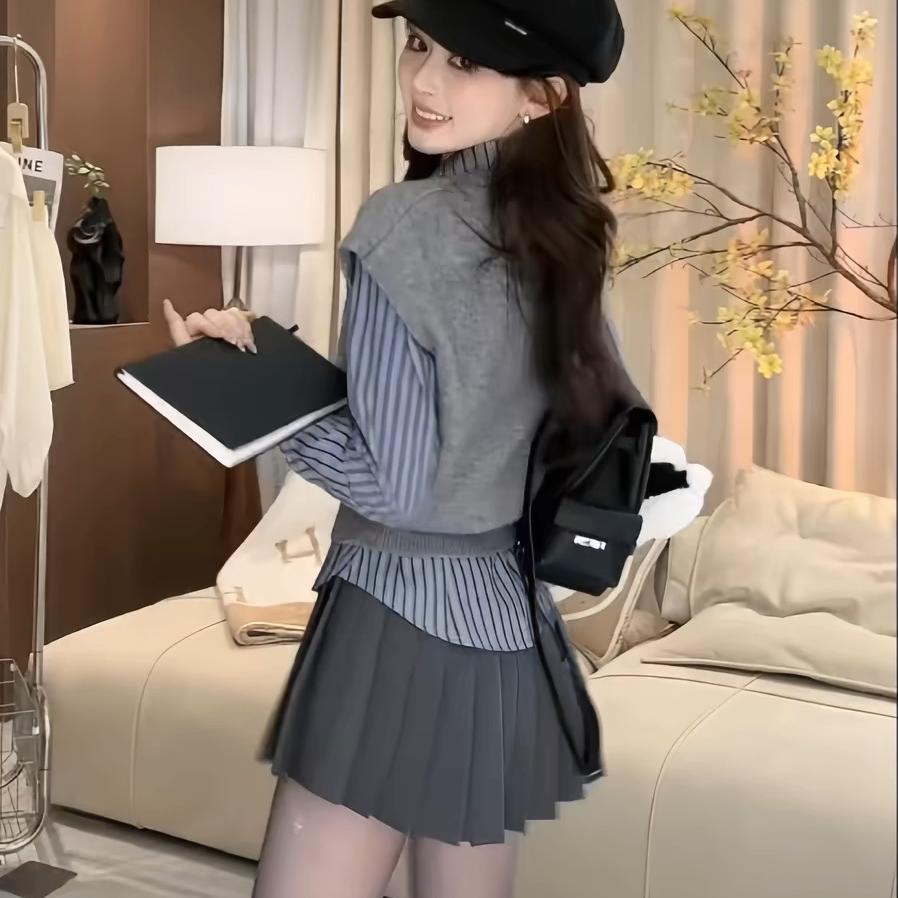 学院风套装女秋冬新款条纹长袖衬衫上衣叠穿针织马甲半身裙三件套