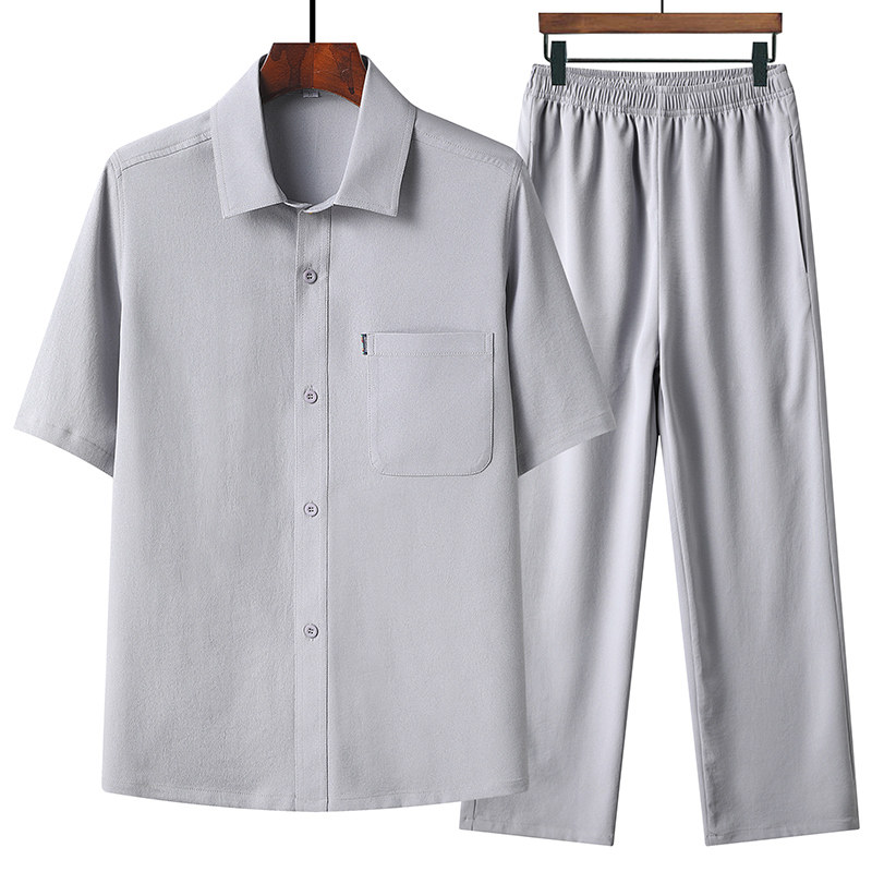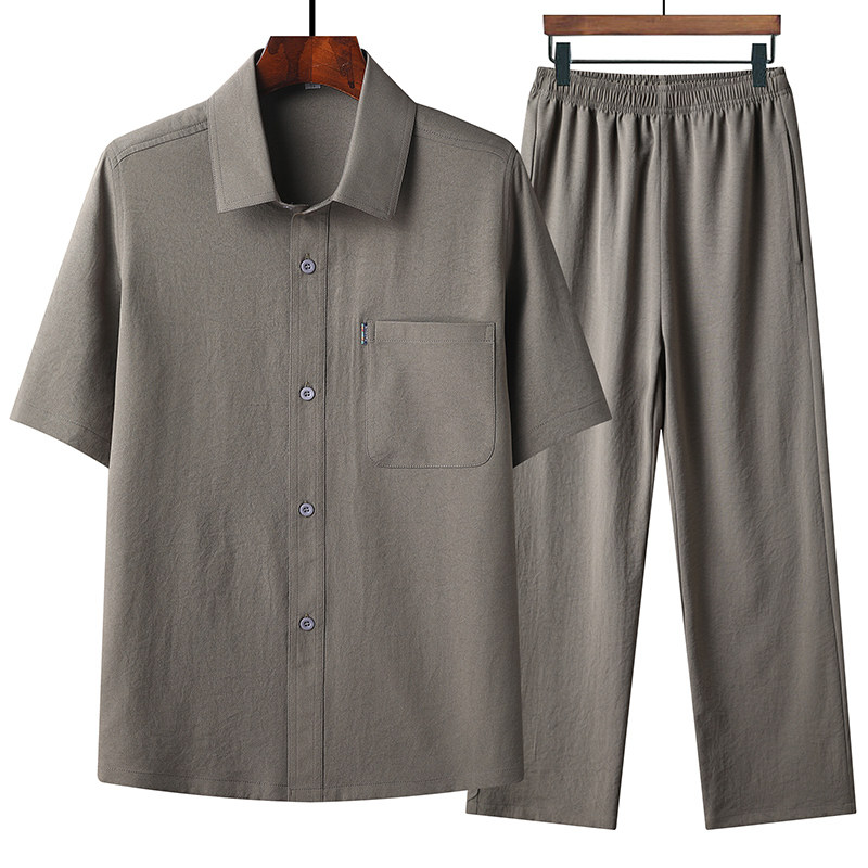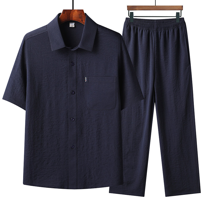 爸爸夏季衬衣男士中老年人短袖衬衫冰丝休闲薄款长袖套装爷爷上衣