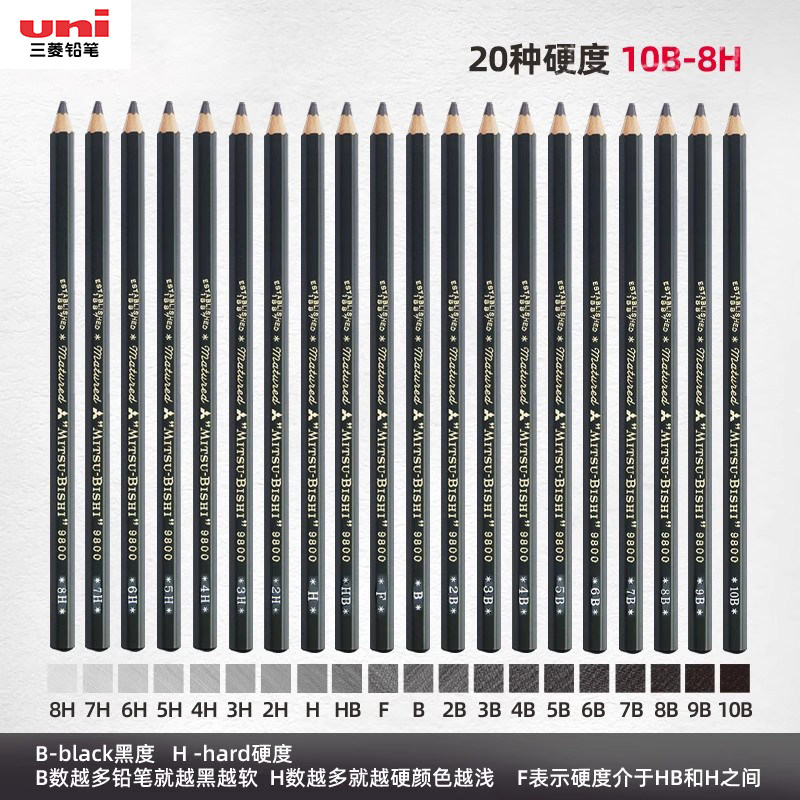 【经典绘画必备】uni三菱铅笔9800DX铅笔木头铅笔绘画素描炭笔绘图2B/HB/2H学生考试涂卡笔美术六角杆量贩