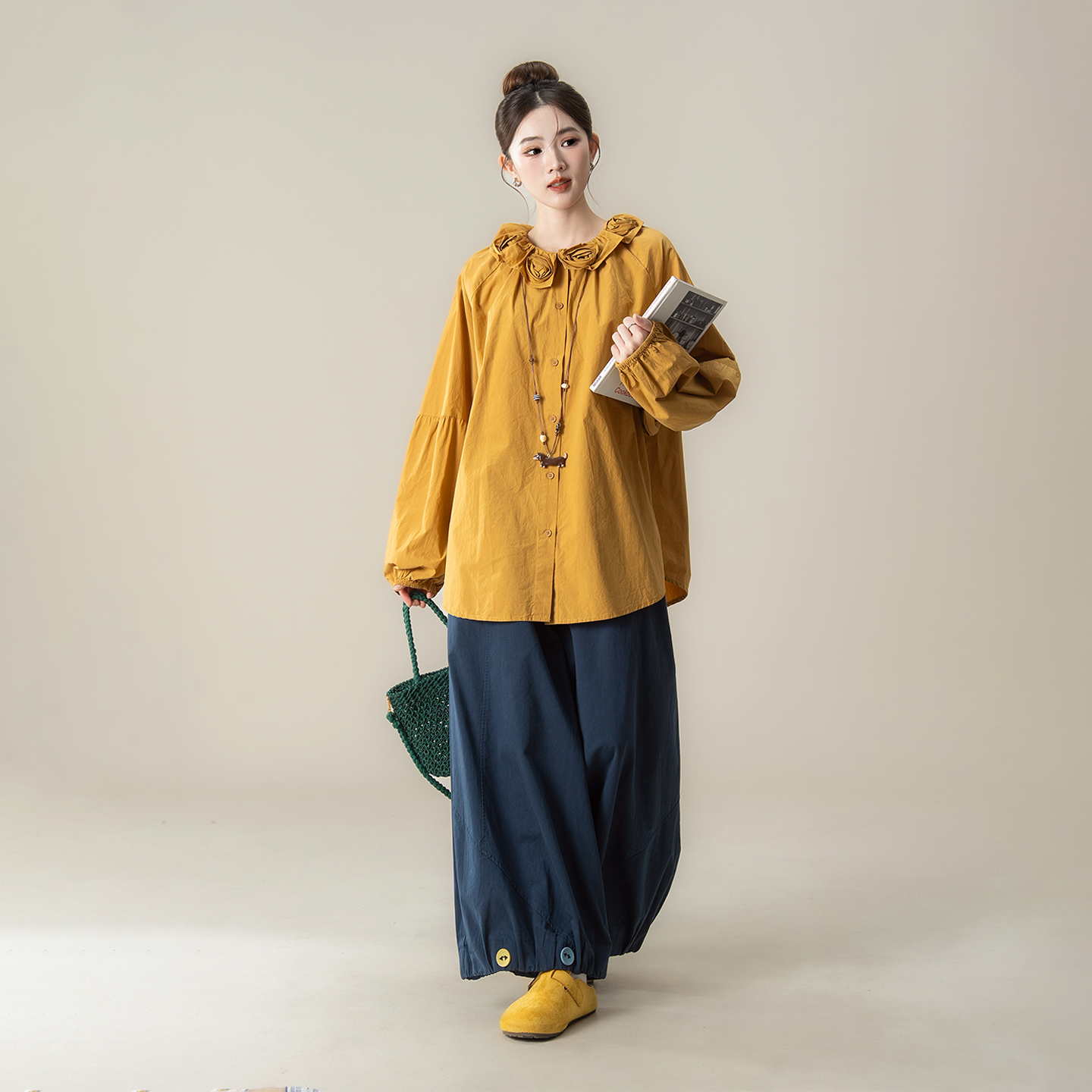 黄色立体玫瑰花朵灯笼长袖衬衫女秋季新款宽松慵懒风显瘦减龄上衣