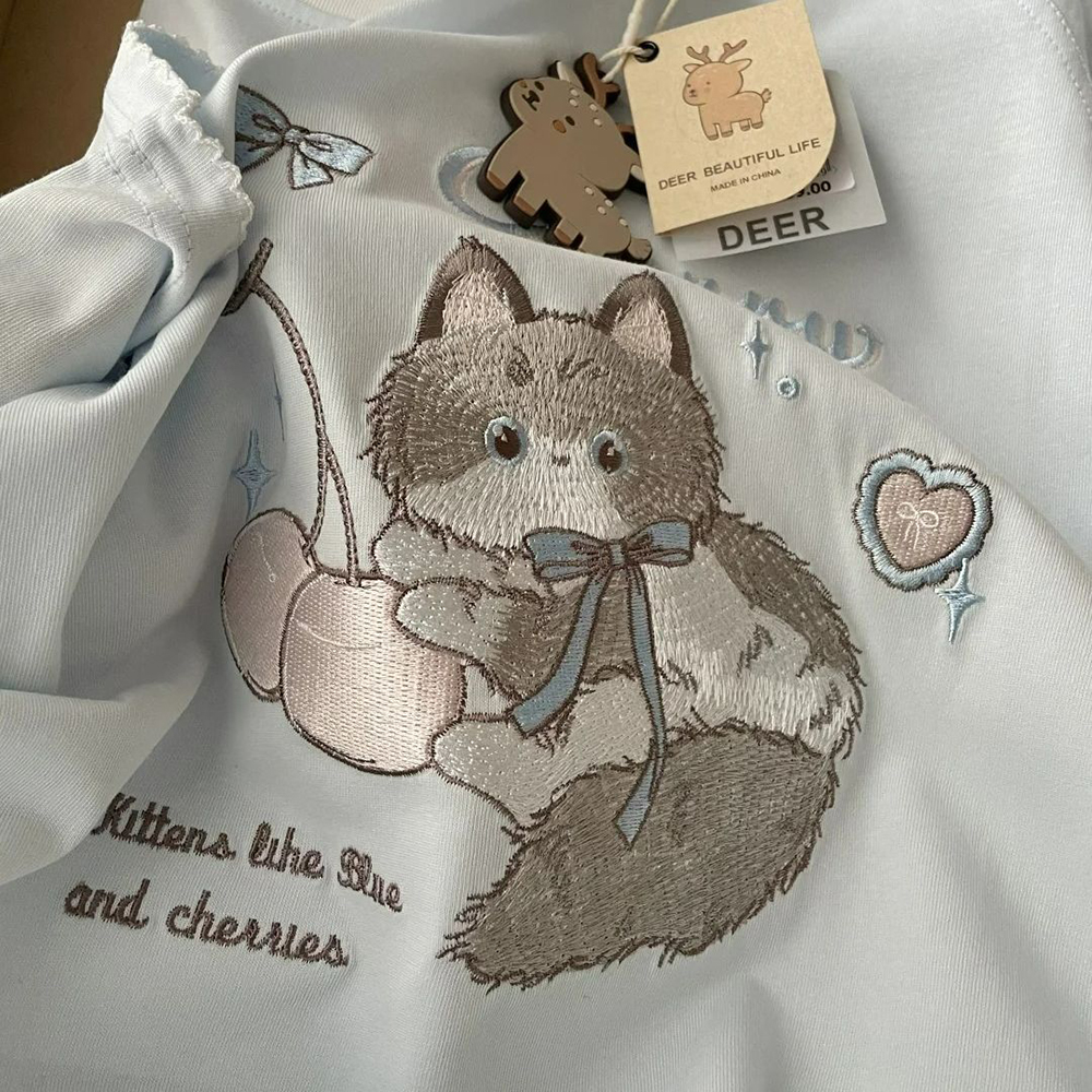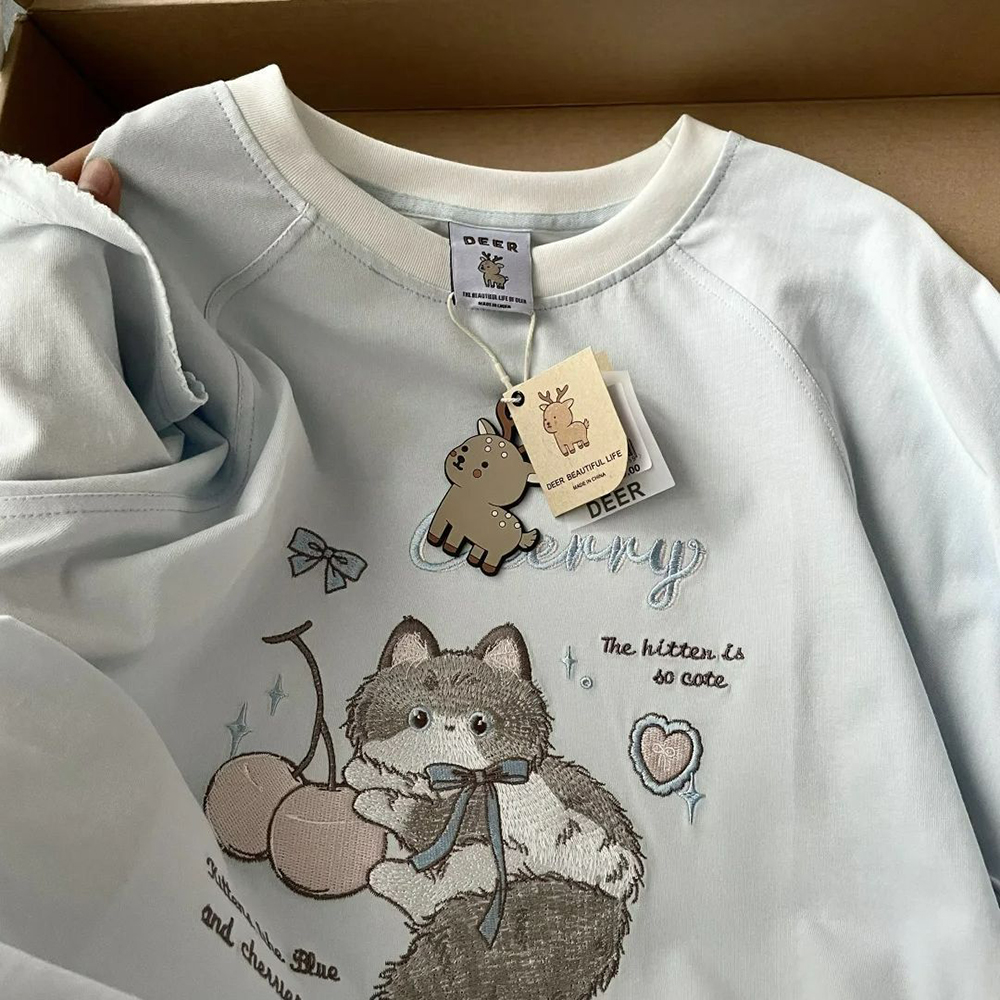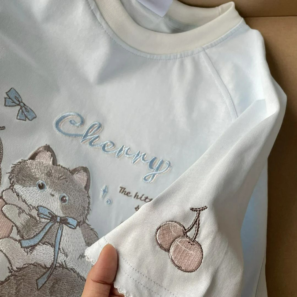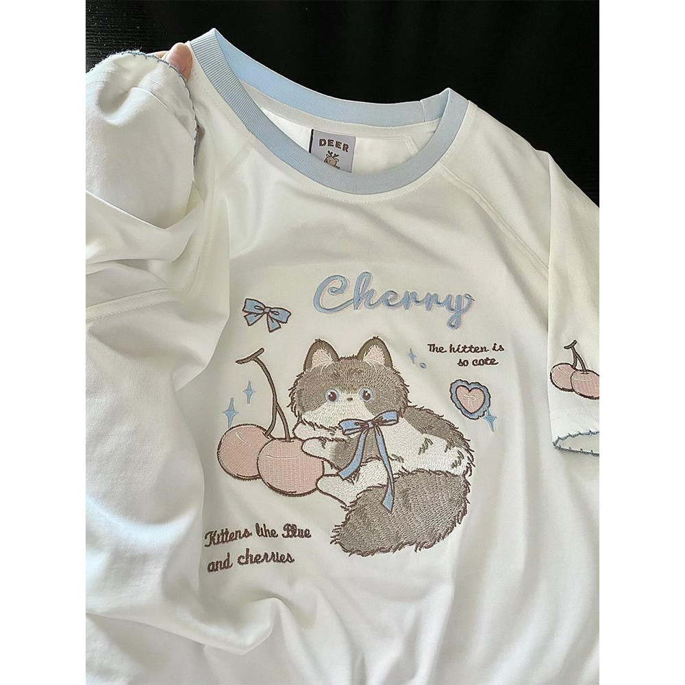 甜美可爱猫咪刺绣刺绣短袖t恤女夏季款ins韩系宽松小个子学生上衣
