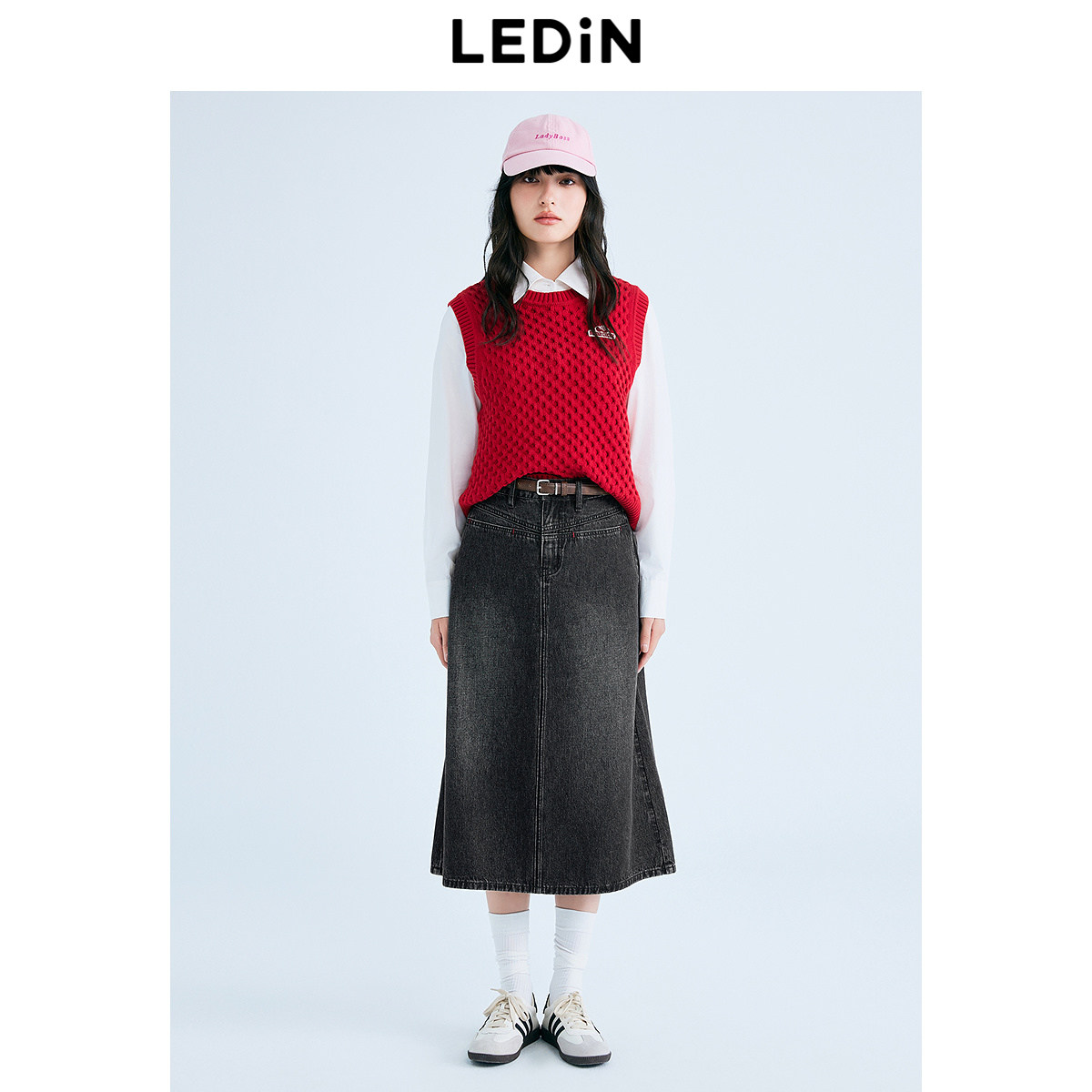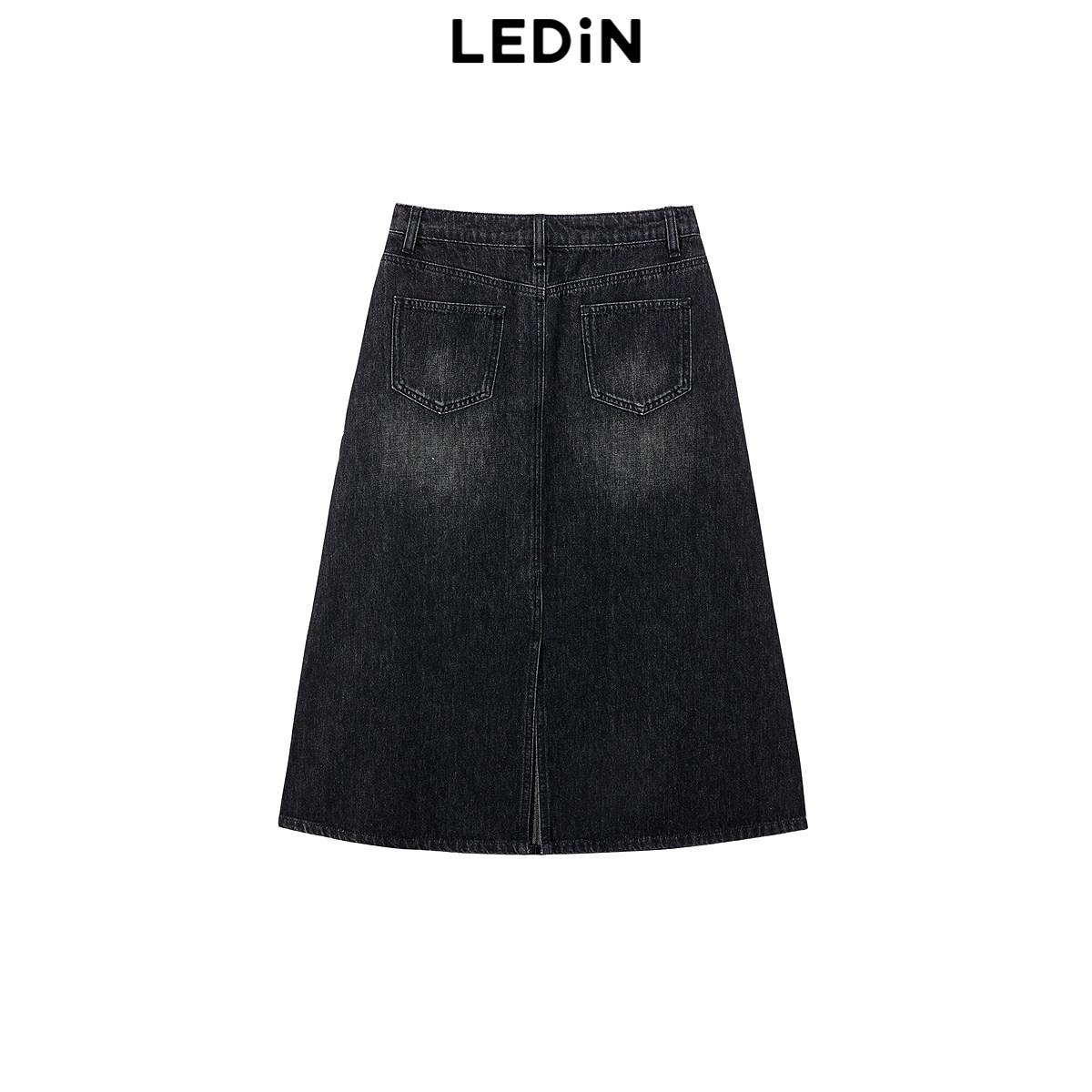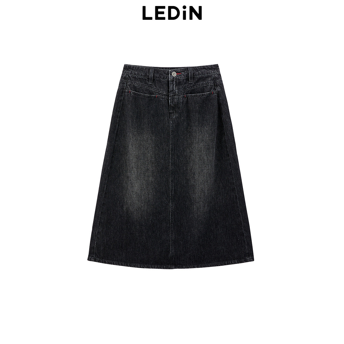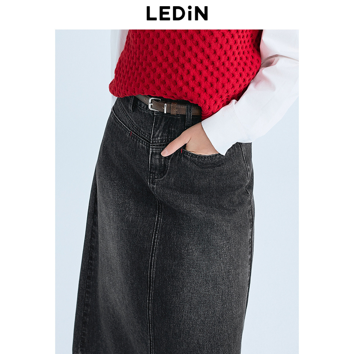 【商场同款】乐町撞色压线直身牛仔长裙春新款灰色半裙C2HFF1311