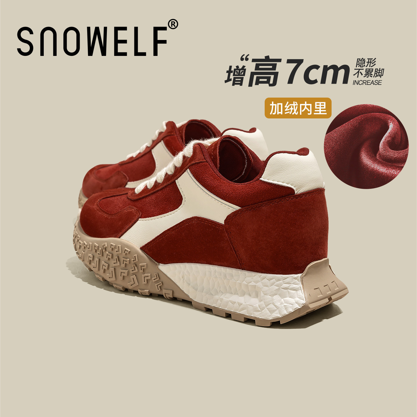 7cm内增高加绒德训鞋女2025新款冬季红色鞋子厚底百搭休闲运动鞋