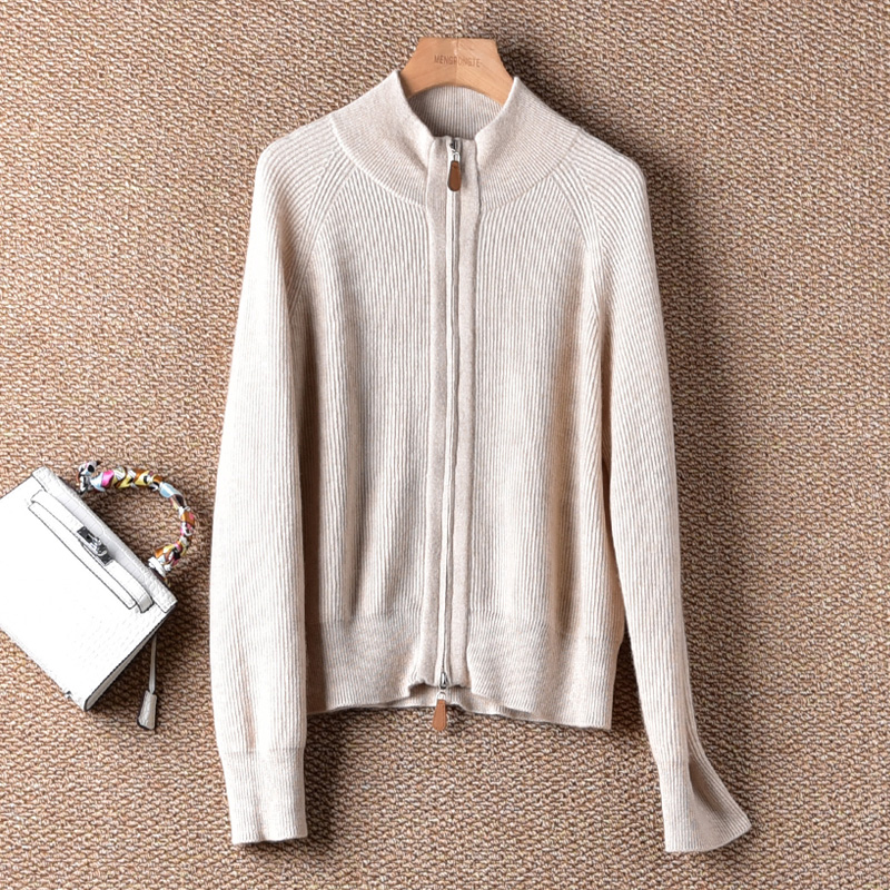 再曦高档100%纯山羊绒开衫女秋季新款休闲半高领拉链针织开衫毛衣