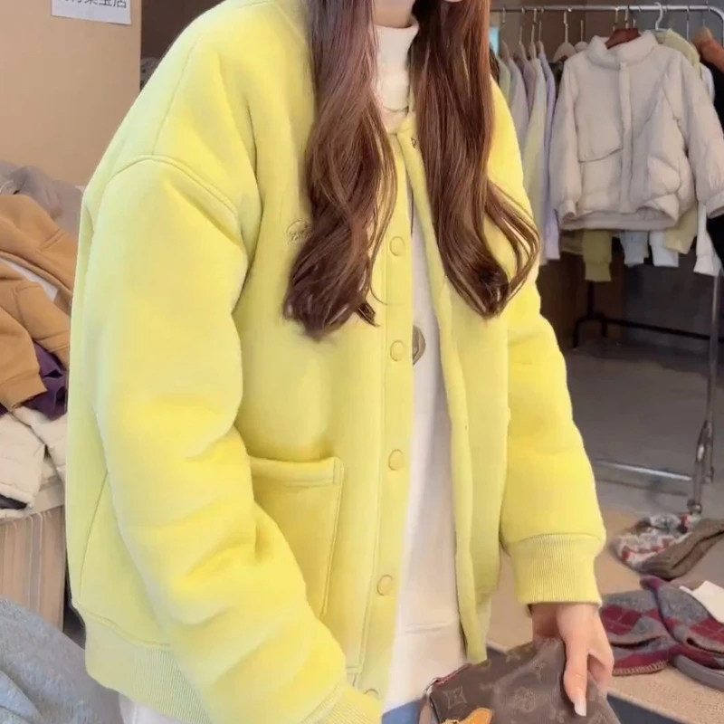 复古减龄加绒加厚开衫外套女款2025冬季新款慵懒风宽松棒球服上衣