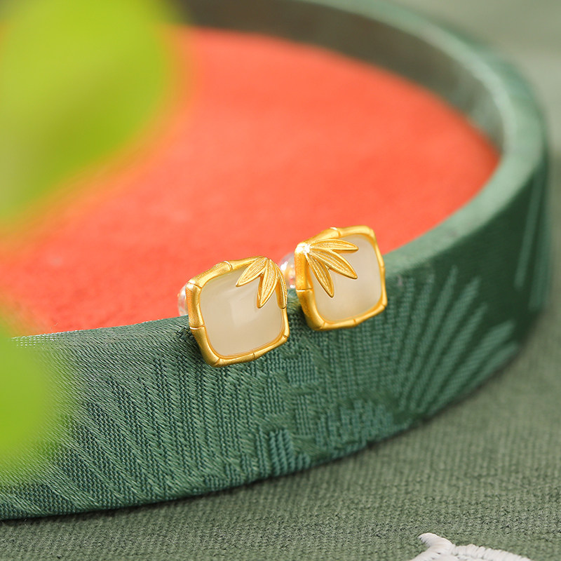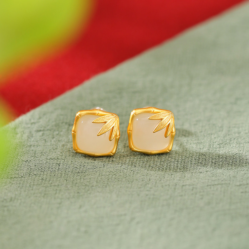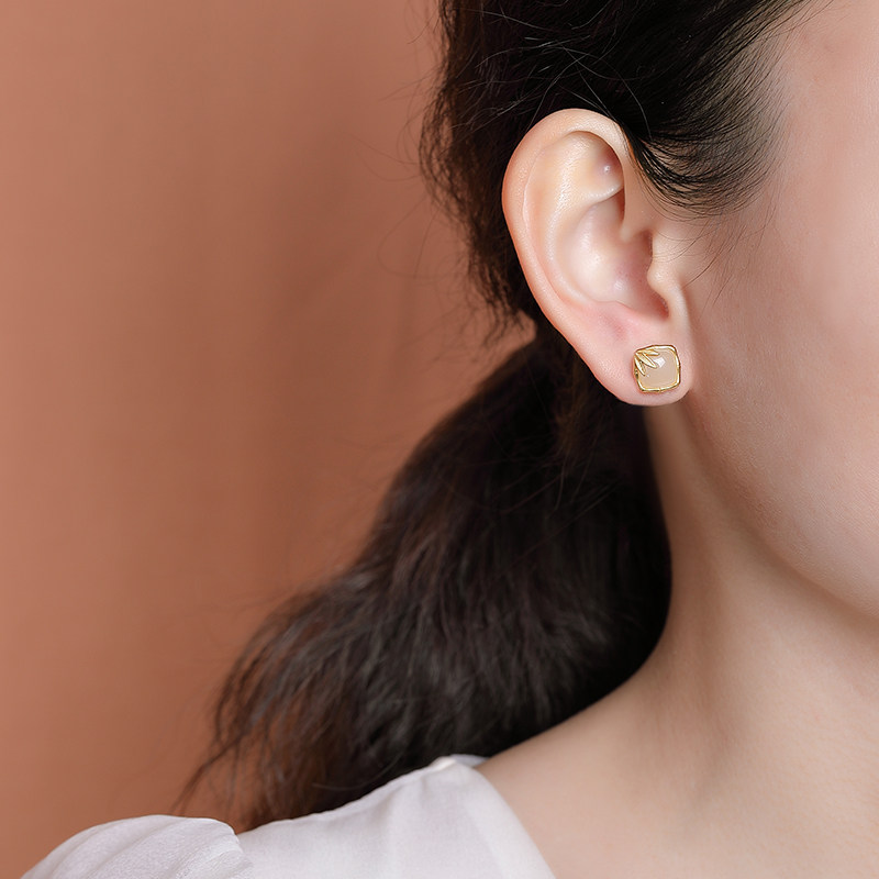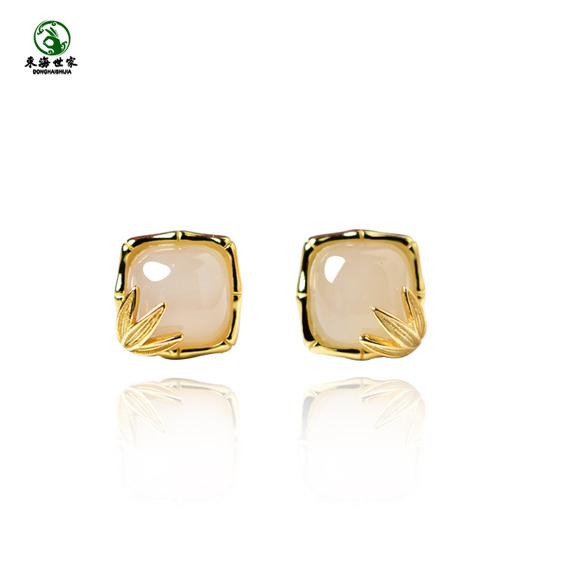 和田玉耳饰女925银东海水晶玛瑙翡翠玉石散珠子竹节方形玄学耳钉