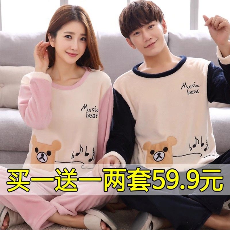 法兰绒情侣睡衣男女秋冬新款卡通可爱保暖珊瑚绒家居服套装可外穿