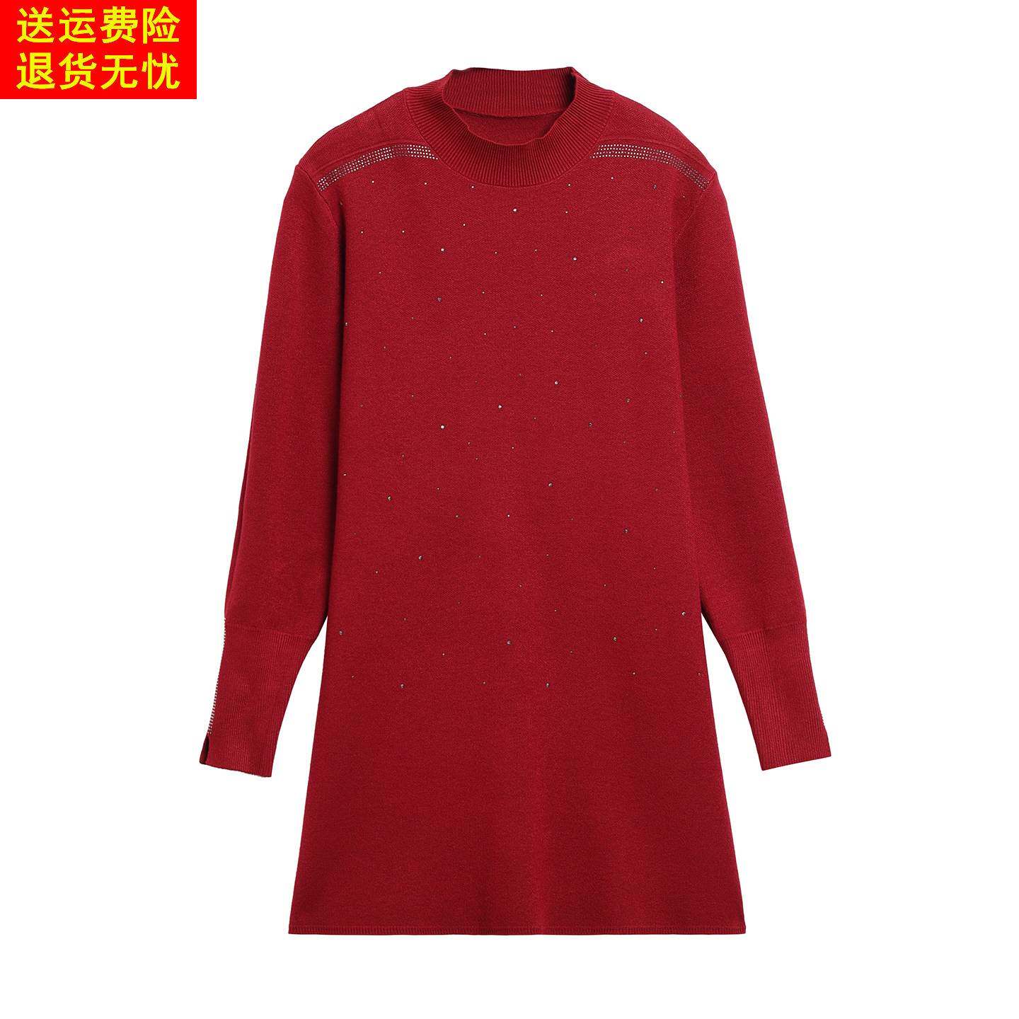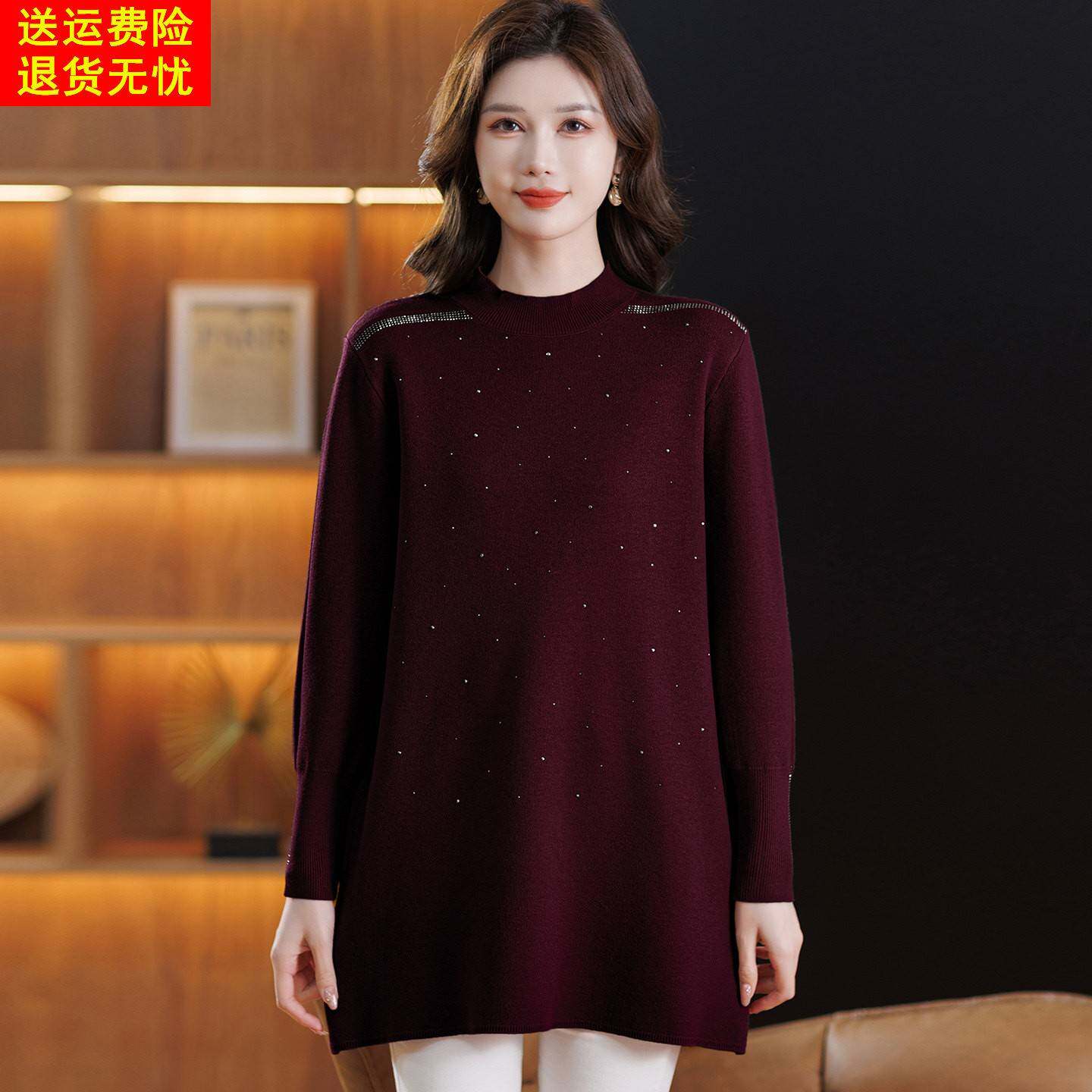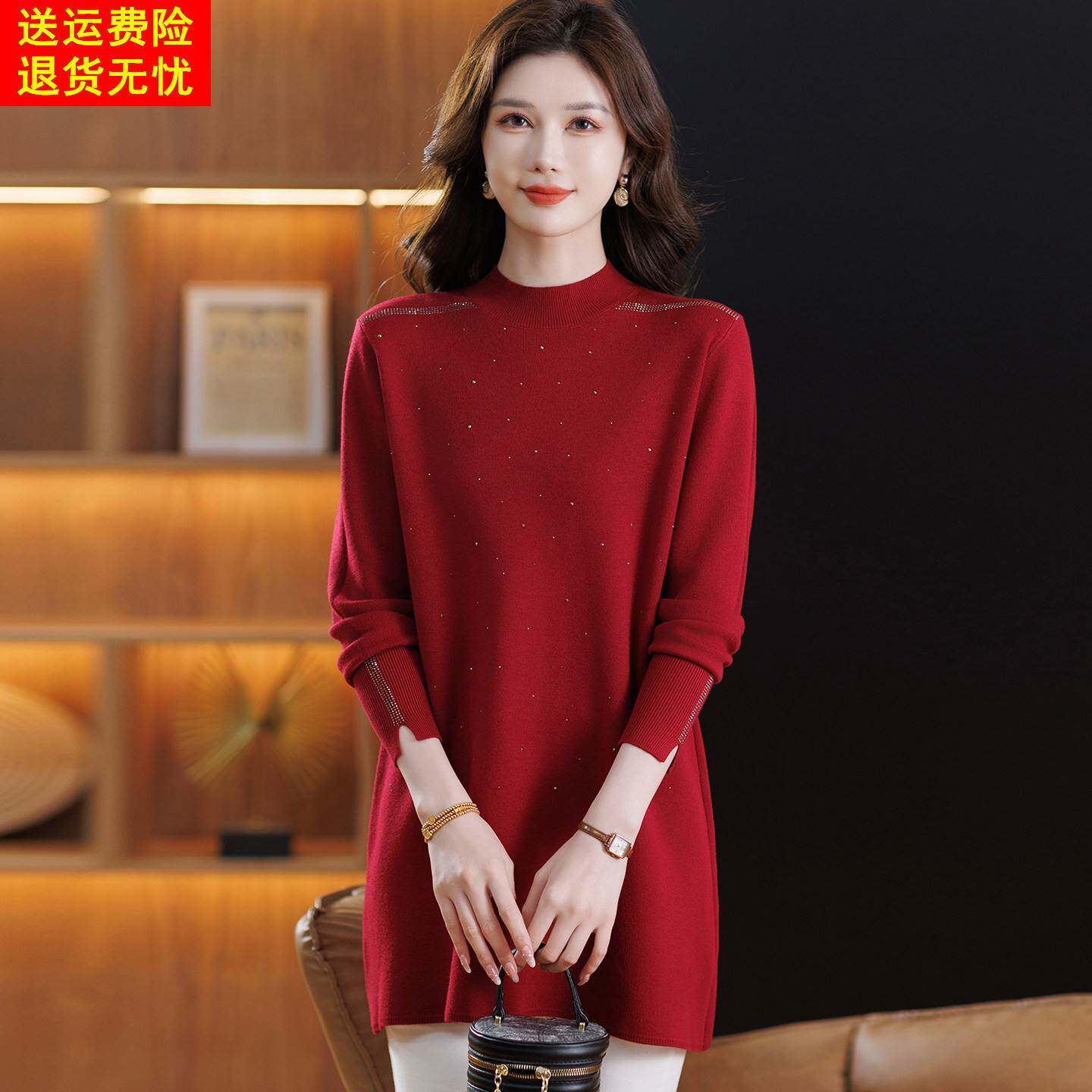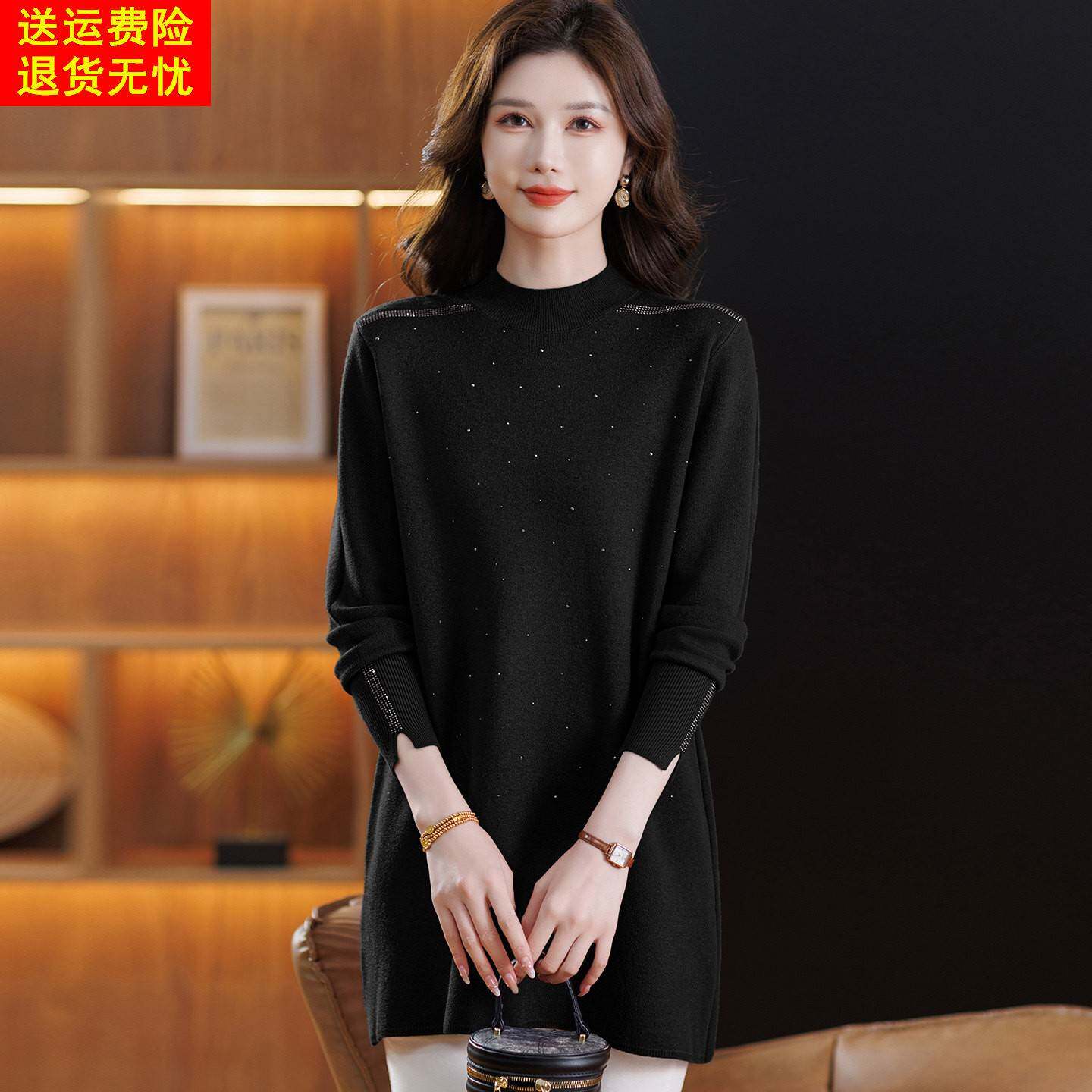 鄂尔多斯市半高领羊毛毛衣裙女秋冬中长款显瘦烫钻内搭打底针织衫
