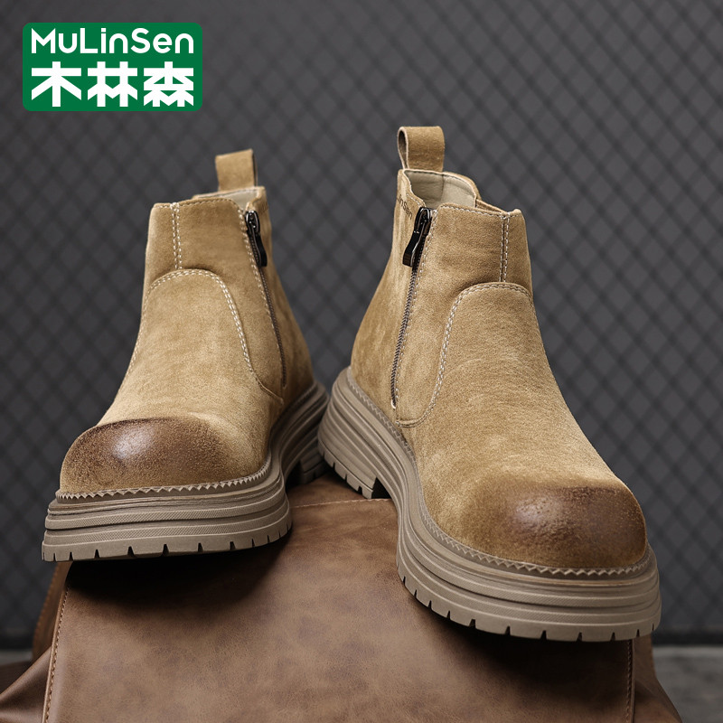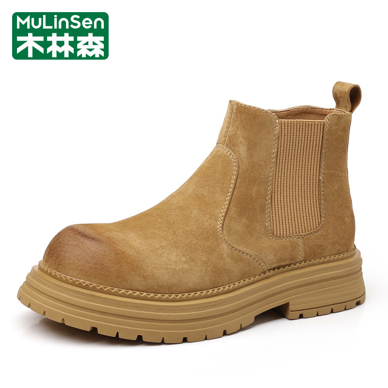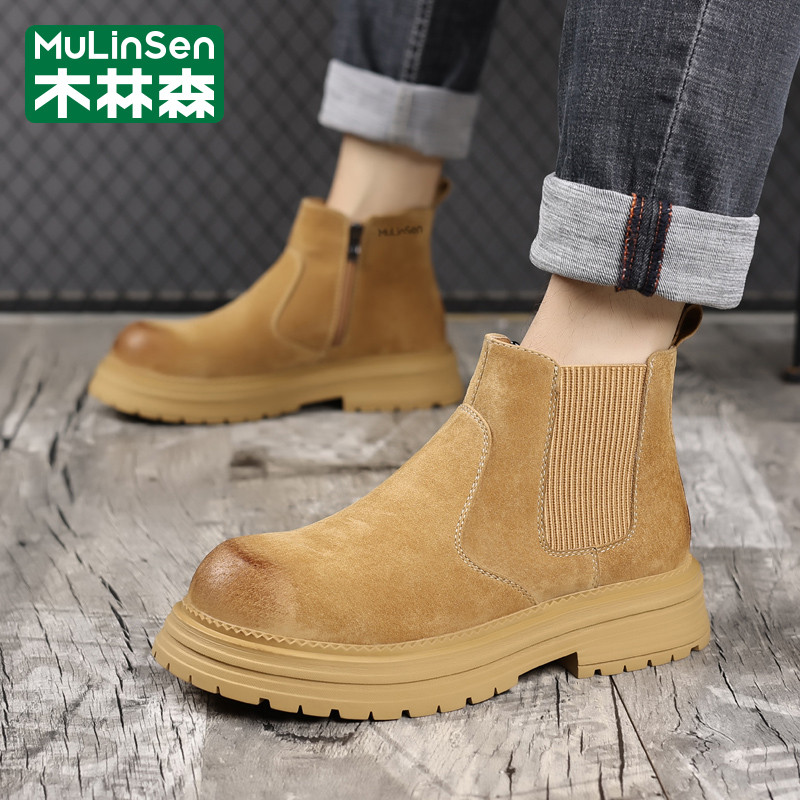 木林森切尔西靴男款冬季休闲英伦高帮工装侧拉链大黄马丁皮鞋短靴