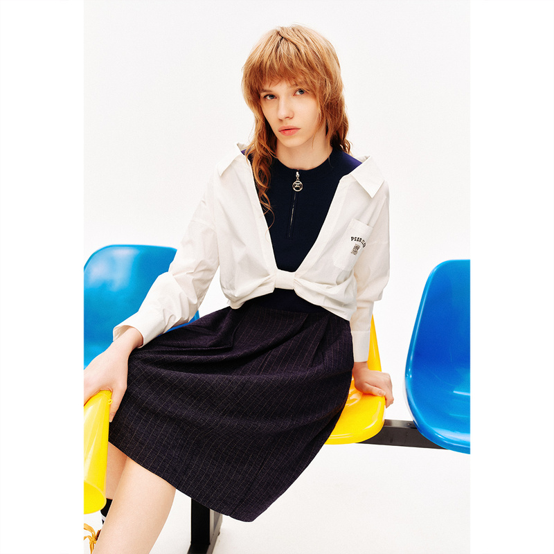PSALTER诗篇翻领落肩白衬衫针织条纹百褶连衣裙两件套春款
