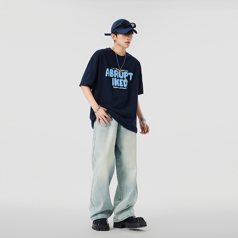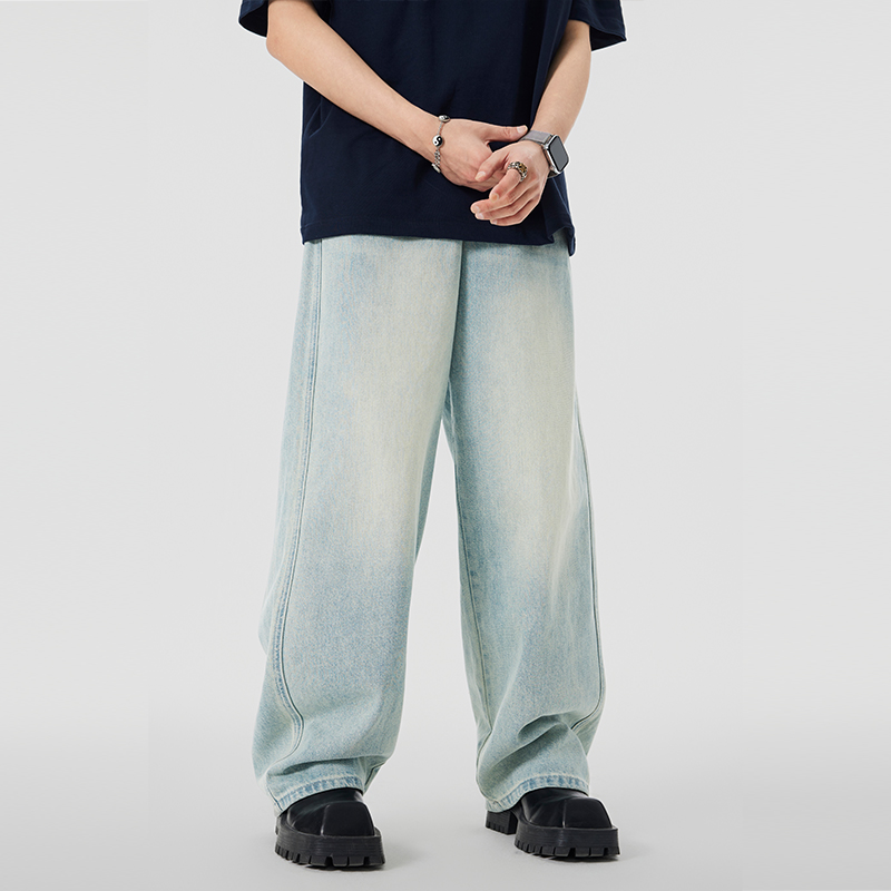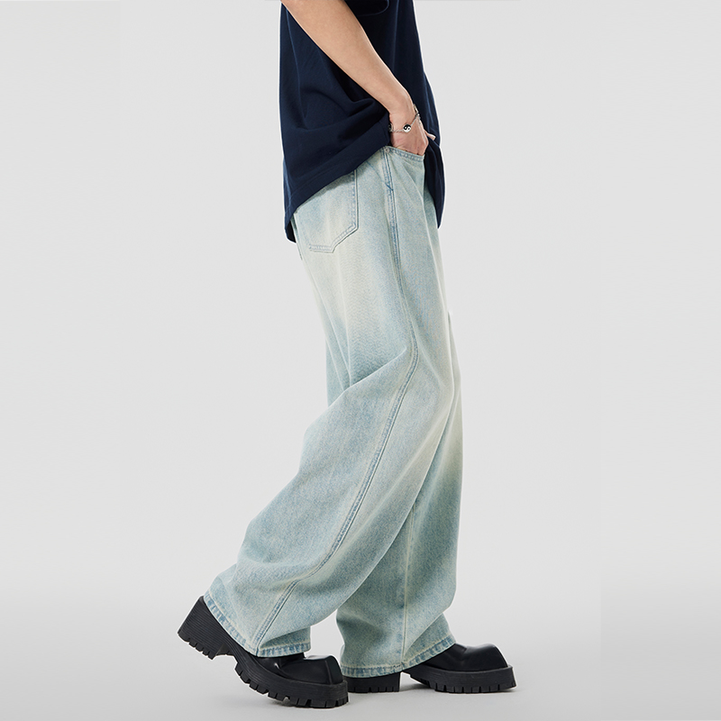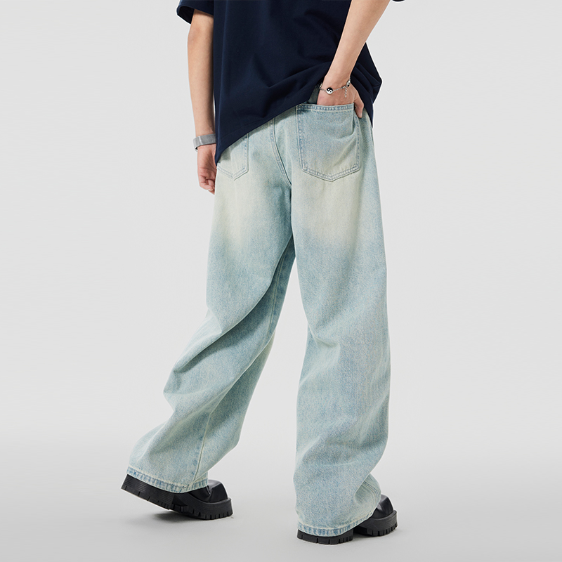 JFU 美式高街黄泥色牛仔裤男秋冬款阔腿长裤子男款宽松直筒潮牌
