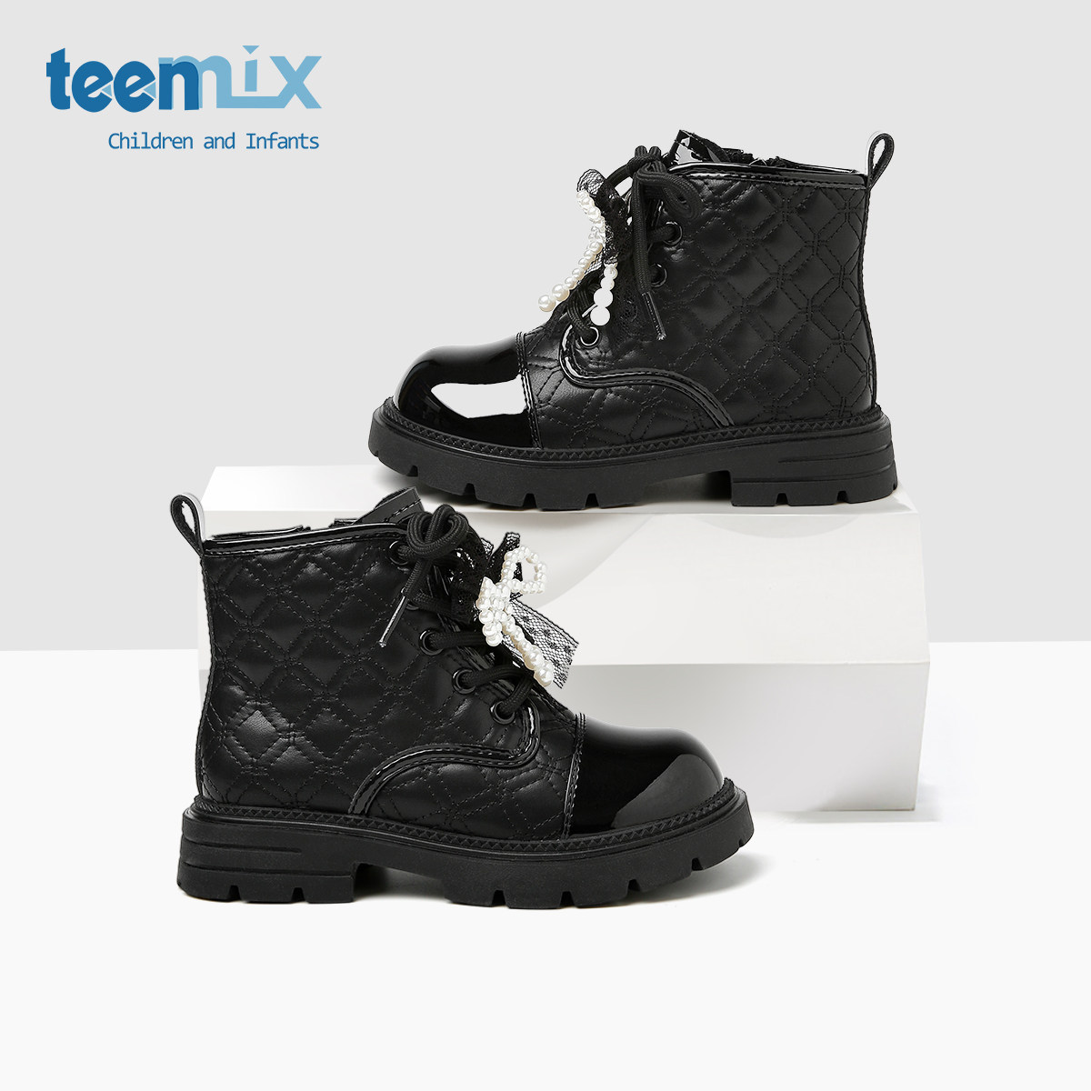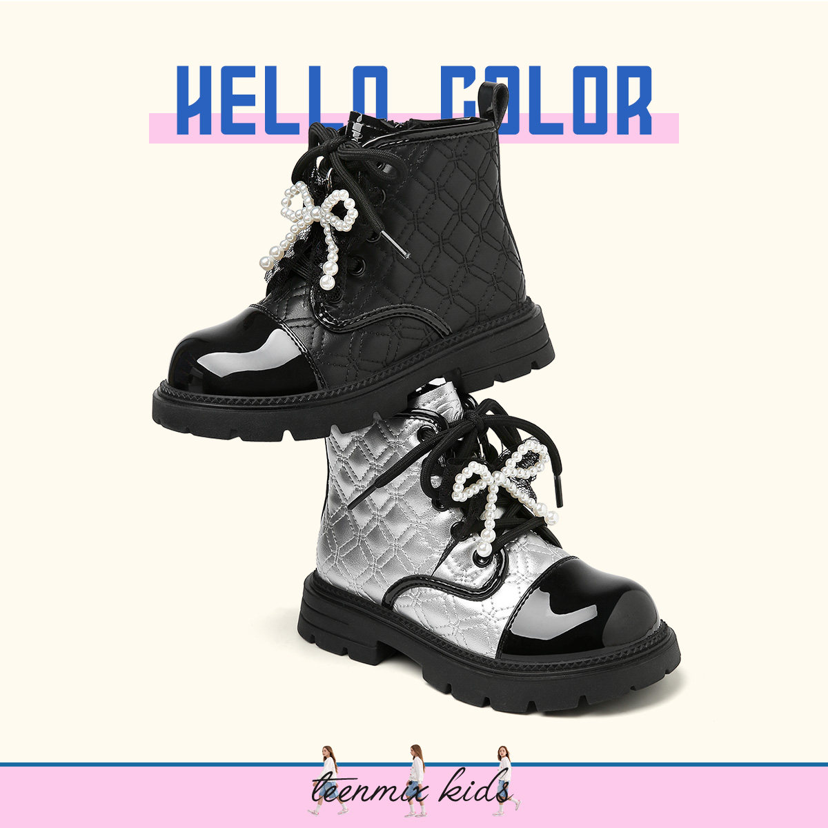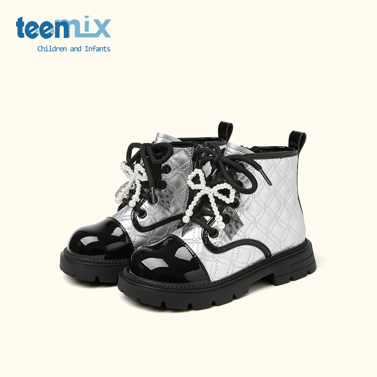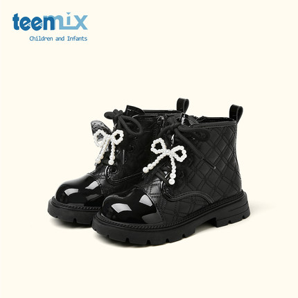 天美意童鞋2026秋冬新款女童时尚加绒靴子马丁靴女宝宝百搭亮面靴