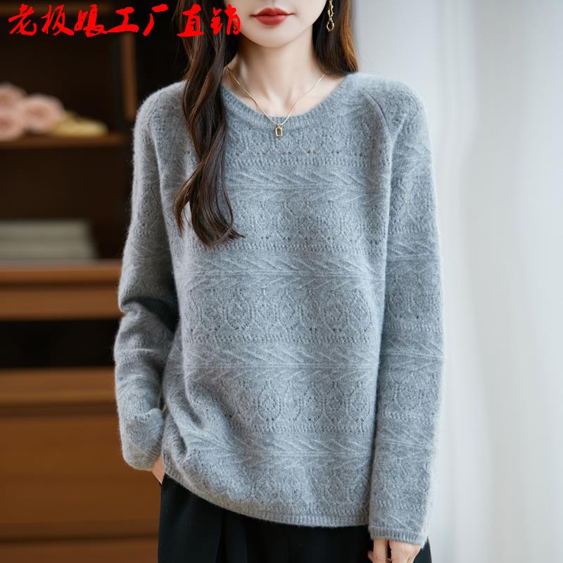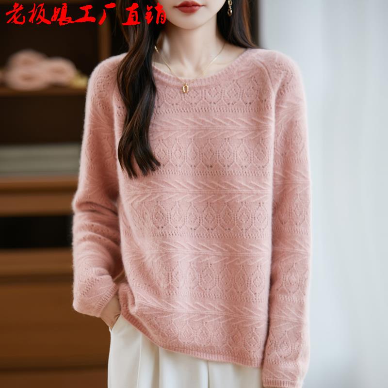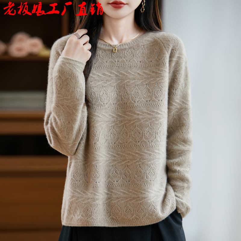 爆款100纯羊毛平面打底衫插肩袖镂空常规款针织圆领纯羊毛衫女士
