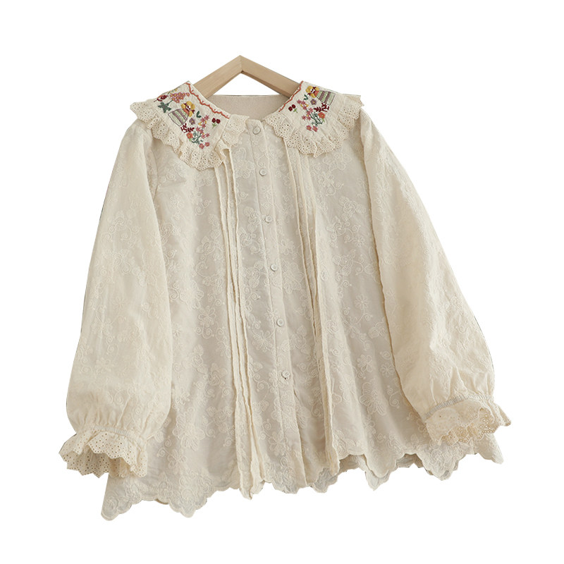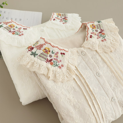 森女系大领子加绒衬衫女宽松百搭重工绣花甜美小清新长袖花边上衣