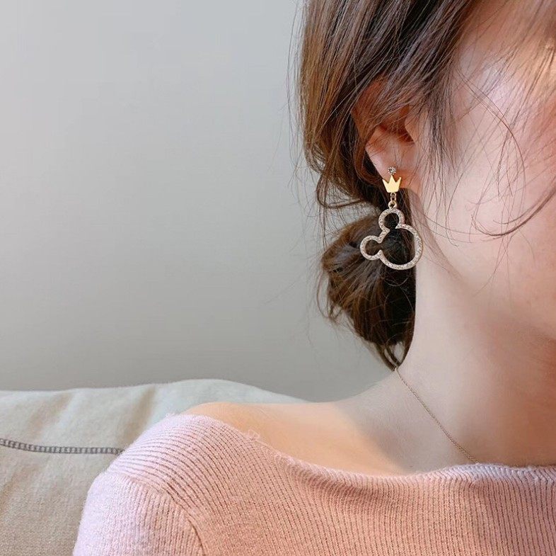 米奇镶钻耳环可爱不对称卡通珍珠耳钉圈高级感米妮迪斯尼乐园拍照